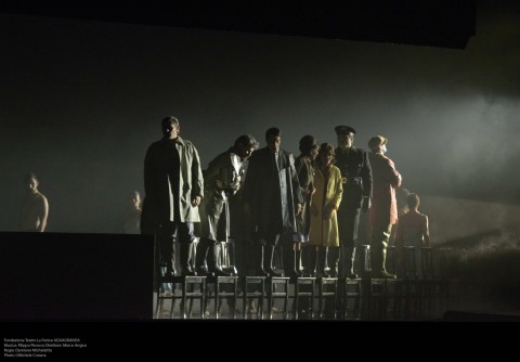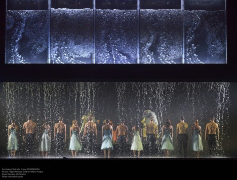Se l’acqua è chiaramente l’elemento visivo portante, vocalmente lo è il coro, qui quanto mai protagonista come ‘voce della laguna’. Brulicante, insistente nel ripetere le parole ‘acqua alta’, ‘acqua granda’, che irrompe e 'presto tracimerà'; con una sfliza di quaranta versi incalzanti descrive il mostro che avanza in una sequela di aggettivi dispregiativi (fosca, losca, sozza, ingozza…) che creano un senso di angosciante consapevolezza in chi osserva nel frattempo la vasca di vetro che si riempie di vorticose onde. Funge anche da schermo questa parete acquosa, ove vengono scandite immagini di repertorio ma anche girate dai sopravvissuti stessi che oggi possono raccontare la tragedia. E come se l’acqua avesse comunque un’anima, le immagini mostrano anche una donna avvolta in un manto bianco sommersa che tenta di liberarsi, forse il richiamo degli abitanti lagunari che arriva fino al cuore del mostro liquido. In linea con la ambientazione sono i costumi di Carla Teti.