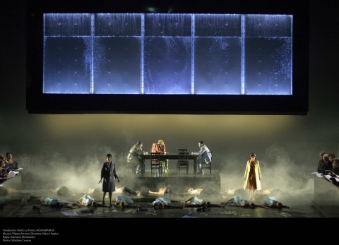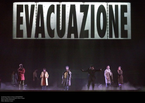 Anche il libretto dello stesso Roberto Bianchin, coadiuvato da Luigi Cerantola offre spunti essenziali, frasi tronche, ripetizioni, abbondanza di aggettivi che esemplifichino la situazione, che non diano mai tregua ai fatti e che lancino dei segnali da cogliere in simbiosi con la musica e l’atmosfera in scena. La musica di Filippo Perocco è priva di banali riferimenti all’acqua in senso stretto: è una lucida guida ed esemplificazione della voce corale di grido e paura, ma anche reazione costruttiva al grande evento naturale. E’ costantemente tesa, lugubre se vogliamo, con squarci di suono che si amplia dal precedente brusio. Udiamo dei fruscii e rumori sinistri ad imitazione della natura, con utilizzo appena accennato di suoni elettronici. Vi sono variazioni improvvise all’intonazione, persino il pianoforte è stato modificato per creare effetti sonori specifici con delle modifiche timbriche, in accordo col resto del suono percepito. Come il libretto è carico di ripetizioni lo è anche lo spartito, sempre nel creare questo senso di oppressione e di imminente catastrofe. E resta così anche nel finale: non vi è una apertura del suono, che resta cupo, sinistro, perché la paura resta comunque tanta e non c’è spazio per una scontata e allegra conclusione. Marco Angius è un esperto del repertorio contemporaneo ed è riuscito a cogliere le atmosfere che l’intima essenza della scrittura musicale richiama seguito da una orchestra della Fenice attenta e precisa. Spettacolare il coro di Claudio Marino Moretti, ribadiamo fondamentale nello spettacolo.
