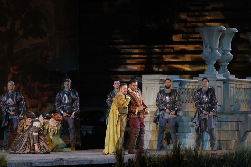 Tra gli altri interpreti, Gianluca Buratto ha portato uno Sparafucile di nerbo e sonorità cavernose, mentre Martina Belli ha offerto una Maddalena sensuale e scenicamente centrata. Il resto del cast si è dimostrato solidissimo: Abramo Rosalen (Monterone), Nicolò Ceriani (Marullo), Matteo Macchioni (Borsa), Hidenori Inoue (Conte di Ceprano), Francesca Maionchi (Contessa), Agostina Smimmero (Giovanna), Ramaz Chikviladze (Usciere) ed Elisabetta Zizzo (Paggio). Il coro maschile, diretto da Roberto Gabbiani, si è confermato all’altezza della tradizione areniana, mentre scene e costumi di Carla Galleri, impreziositi dalle luci di Claudio Schmid, hanno contribuito a mantenere vivo l’impatto visivo.