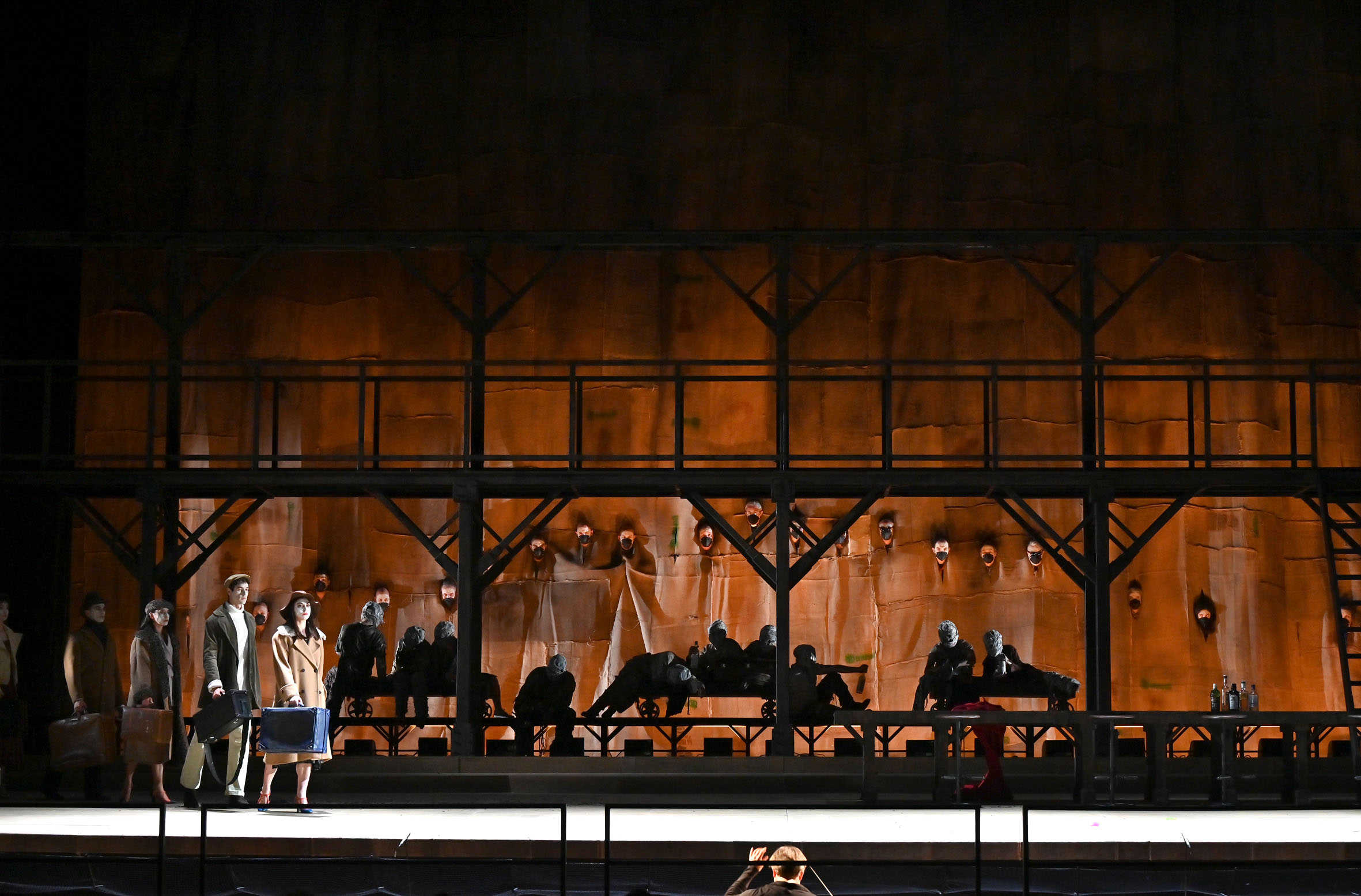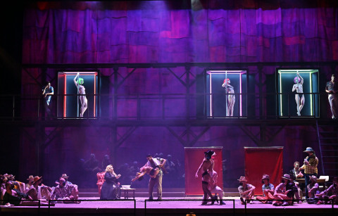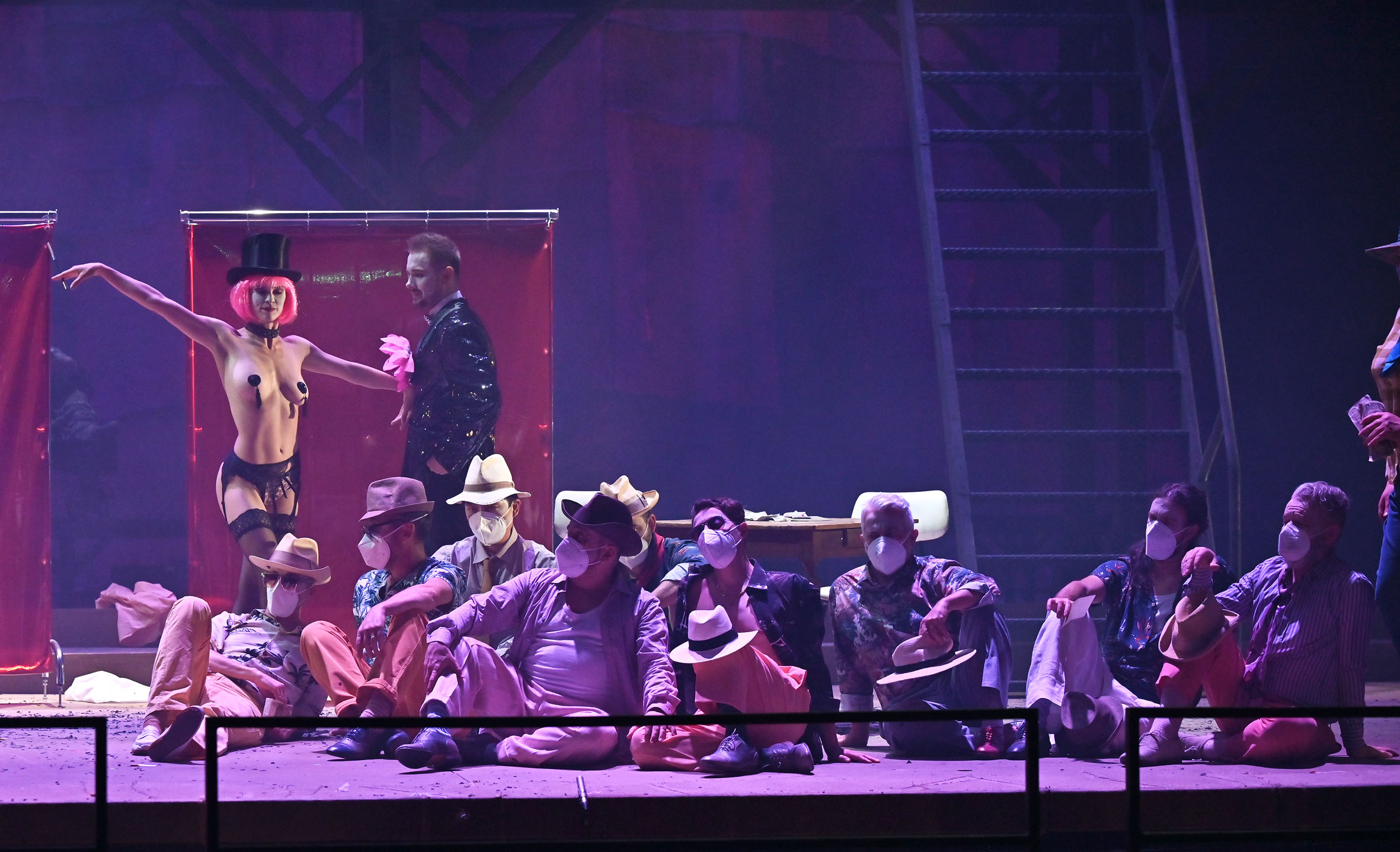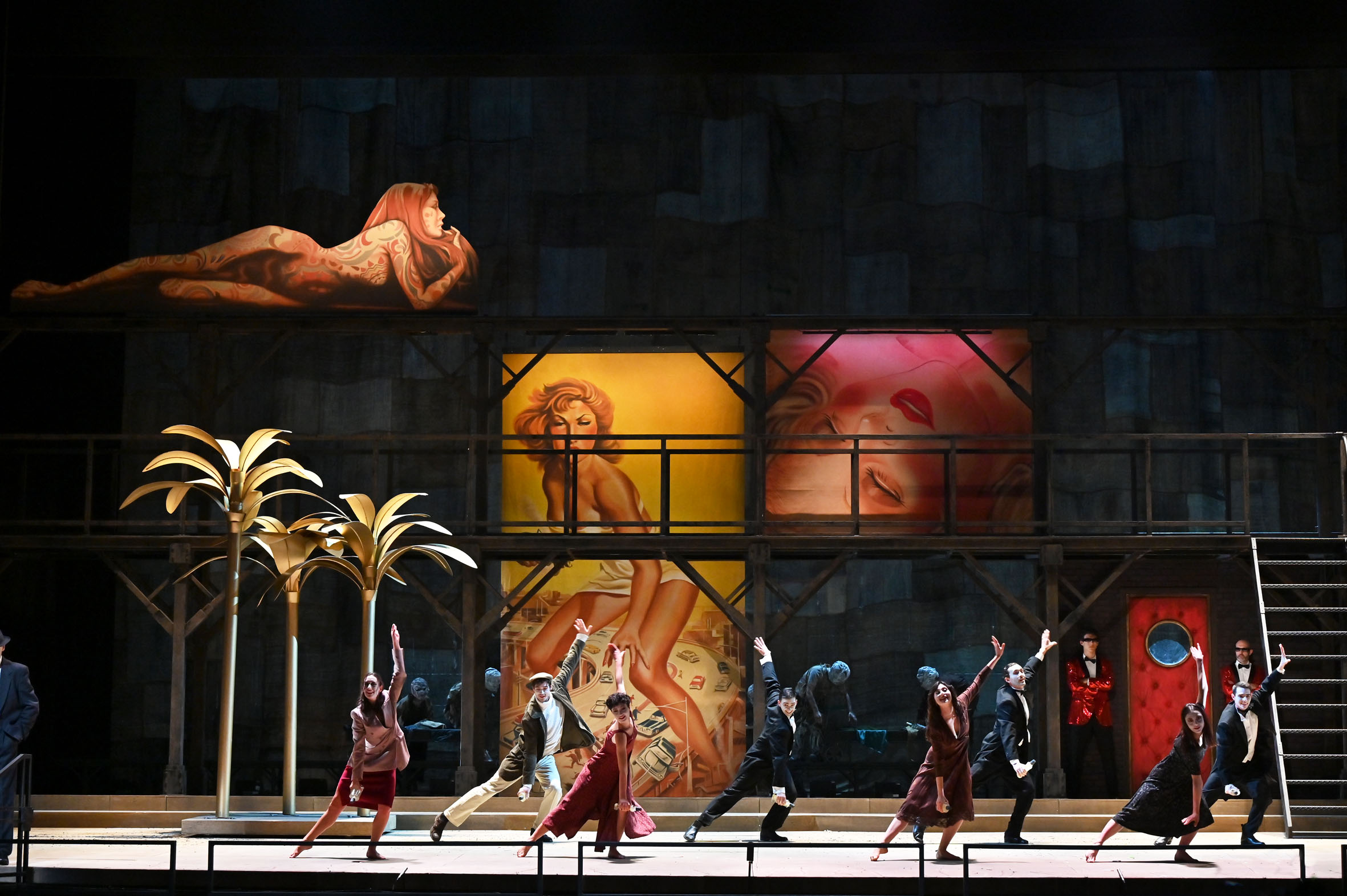 Mostrando il meccanismo per realizzare la città-trappola, la regia di Henning Brockhaus, con le funzionali scene di Margherita Palli (nei quali, per la verità, facciamo un po’ fatica a ravvisare il segno di Edward Hopper, come viene enunciato nel programma di sala) alla quale contribuiscono le suggestive luci di Pasquale Mari, i costumi di Giancarlo Colis, i video di Mario Spinaci e le un poco datate coreografie di Valentina Escobar, risponde alle intenzioni degli autori: ricordare costantemente al pubblico che sta assistendo ad uno spettacolo. Eppure il risultato, tutt’altro che spiacevole, non è all’altezza delle premesse e soprattutto della potenza tellurica del testo, persino più estremo della ben più nota “Opera da tre soldi”: Più che una satira, cruda, volgare, dove tutto sarebbe registicamente concesso e anche oltre, Brockhaus si limita, in maniera anche un po’ scontata, ad un ritratto impietoso della società dei consumi, in cui l’unico crimine possibile è la mancanza di denaro.
