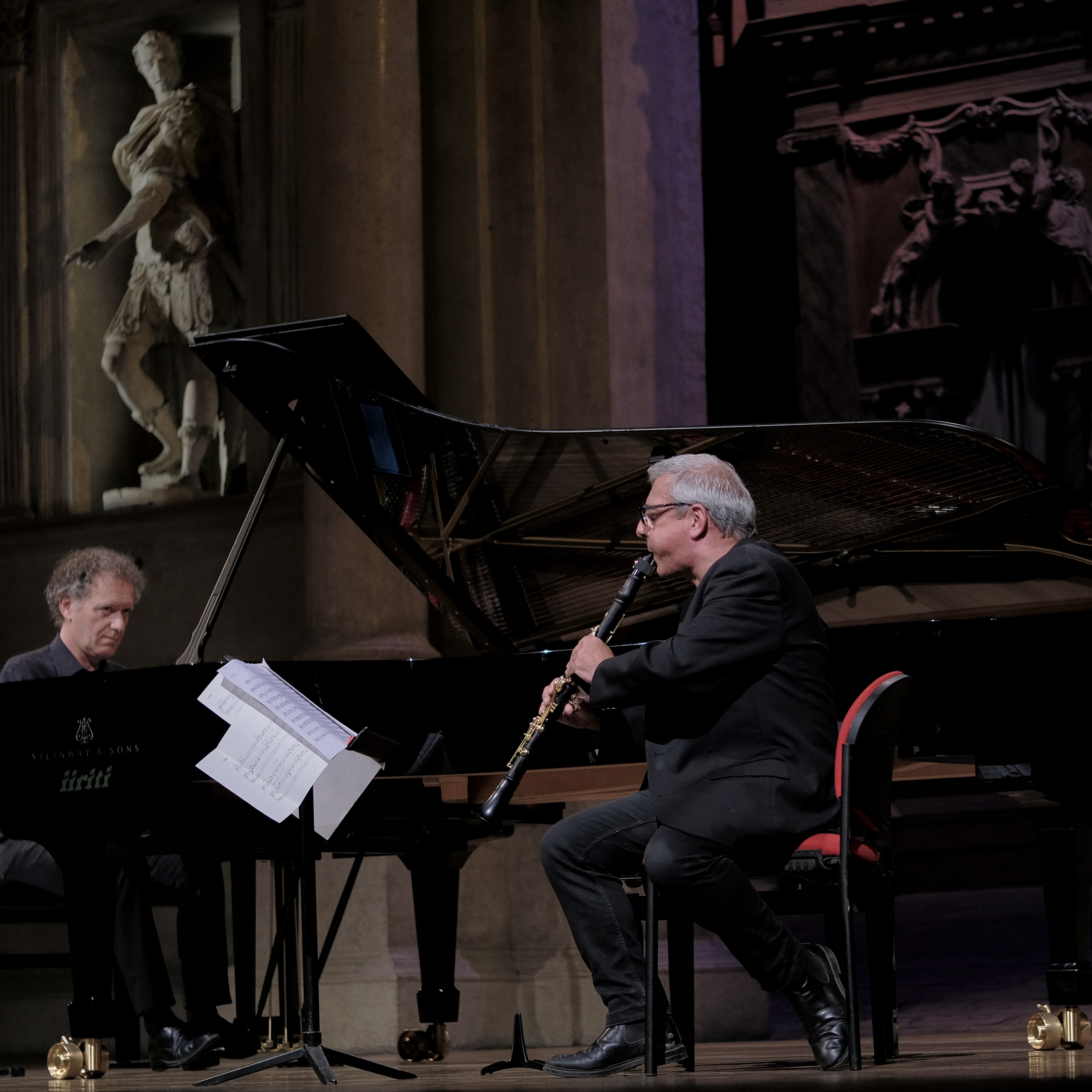 Per la trentaduesima edizione delle ‘Settimane musicali al Teatro olimpico di Vicenza’ abbiamo scelto una serata decisamente particolare e coraggiosa da parte dell’organizzazione, in quanto alle porte di un ponte vacanziero, che non ha scoraggiato un buon numero di spettatori a rimanere in città ed approfittare di quanto offerto dal bel teatro cittadino, che vale di per sé una visita, anche da parte dei turisti che invece hanno deciso di soggiornare proprio nella città berica per il lungo fine settimana. Con il titolo ‘Dialoghi’ si è voluto sottolineare un rapporto splendidamente simbiotico creato da due musicisti di razza, Andrea Lucchesini, stimato pianista a livello internazionale, esperto delle composizioni di Luciano Berio ed impegnato in collaborazioni prestigiose come con l’Accademia di Santa Cecilia a Roma, direttore artistico de Gli amici della musica di Firenze, e Gabriele Mirabassi, eclettico interprete del clarinetto, musicista di grande talento, con all’attivo diverse incisioni discografiche e collaborazioni con grandi artisti del Jazz internazionale.