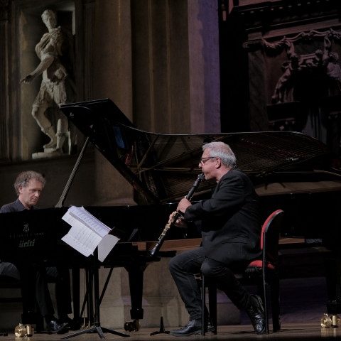 Una conversazione quasi senza soluzione di continuità quella del concerto offerto venerdì sera, in cui entrambi gli Artisti si sono confrontati ed hanno proposto una full immersion nel repertorio proposto, ossia una magnifica rilettura delle composizioni di capisaldi della musica classica, approdando ad artisti modernissimi e scomparsi da poco come Jobim e Guastavino, passando per André Mehmari, al quale si devono le riletture di alcune delle più interessanti sonate di Domenico Scarlatti in chiave jazzistica, da cui parte questo viaggio musicale tra culture e generi musicali affini. Come lo stesso Mirabassi ha spiegato al pubblico, interrompendo per un momento l’ipnotica magia creatasi in sala, proprio lo studio approfondito della musica del compositore partenopeo ha suscitato in lui l’idea di queste interconnessioni musicali, poiché tra le varie tappe della sua vita egli si stabilì anche a Lisbona e poi a Siviglia, e nell’ultimo periodo a Madrid, subendo l’influenza della musica popolare portoghese e spagnola. Così in modo naturale vengono concepiti questi dialoghi tra musica tradizionale e classica, passando per il jazz, per un risultato incredibilmente coinvolgente ed accattivante. Il Maestro Lucchesini non si limita certo ad accompagnare il suo complice in questo viaggio cultural – storico, anzi dialoga appunto con il clarinetto intrecciandosi nelle melodie strette, tra le note raddoppiate, gli arpeggi velocissimi ed i ritmi articolatissimi; dal canto suo Mirabassi si immerge letteralmente nello spartito, quasi cercando ‘fisicamente’ di entrarvi e cogliendo tutte le sfumature e le variazioni offerte di volta in volta. Così si susseguono col medesimo spirito atemporale dei canti di Jobim tutti gli altri brani con un flusso di totale immersione e magnifico dialogo tra generi che rinascono e si reinventano ad ogni ascolto.