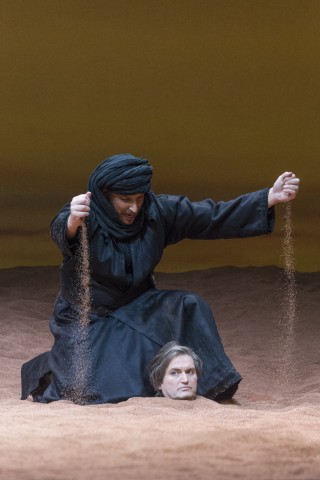 In aggiunta, alcune soluzioni registiche sono sembrate del tutto superflue quando non addirittura ridicole. Selim che si flagella a sangue struggente d’ amore per Konstanze con in mano un inutile mazzo di rose è una scena parecchio discutibile; banali risultano certi cambi scena con buio/luce per spostare i protagonisti semplicemente da una parte all’altra del palco, e gli interminabili silenzi in attesa dell’azione successiva hanno reso lo spettacolo insopportabilmente lento e noioso. Senza contare il fatto che si è reso necessario modificare ed incrementare anche i dialoghi per poter dare una parvenza di logica a quanto esposto. I costumi dignitosi per il contesto sono di Heide Kastler, mentre le luci a cura di Reinhard Traub non hanno aggiunto nulla di particolarmente speciale alla desertica scena. Si possono fare grandi cose con grandi idee, ma a nostro parere non è accaduto in questo caso.