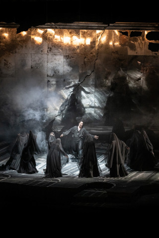 Ultima recita del Don Giovanni di Mozart al Teatro Regio di Torino, che vede protagonisti il Maestro Riccardo Muti alla testa dell’Orchestra torinese e la figlia Chiara Muti a capo di un team creativo che ha costruito una regia accattivante e per niente scontata, in cui si succedono avvenimenti perfettamente in linea con il libretto, ma con un tocco di originalità e quel giusto brio che si interseca perfettamente nelle trame del furfante sciupa femmine dal destino terribile da lui stesso voluto. Il Don Giovanni di Chiara Muti è costantemente circondato da figure evanescenti, ombre oscure di donne nel passato del protagonista che agli occhi di chi assiste sembrano anticipare quanto accade inevitabilmente all’anima di colui che, a differenza degli altri personaggi in scena, non è un fantoccio mosso da misteriosi fili calati dall’alto, che simboleggiano quanto precario sia invece il libero arbitrio di ciascuno di noi nella vita reale. Storie di artisti/fantocci/personaggi che si muovono sulle rovine di un palazzo un tempo meraviglioso ed oggi in pezzi, tra drappeggi logori di un teatro che ha vissuto il suo tempo di gloria ed è ormai simbolo di decadenza. Questo Don Giovanni che si districa tra le impalcature rovinose entrando ed uscendo dalle botole, è un Re Sole che fa e disfa a suo piacimento, che ha del malvagio ma anche dell’ironico nelle sue movenze, nella sua risata spiritata, nel sottrarre lo sguardo agli interlocutori scomodi per poi tornare baldanzoso se il terreno è più libero.