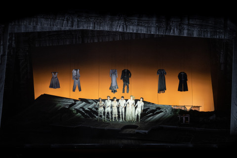 Così tutte le altre ‘marionette’ che da lui dipendono ed attorno a lui ruotano, hanno tratti ben definiti, tra il buffo esasperato ed il tragico convinto e sono agghindate ricordando personaggi della storia francese, dal passato più lontano fino alle epoche più recenti. E se le molte donne ingannate in precedenza appaiono in scena piangenti e disperate, così le protagoniste del presente si mostrano altrettanto succubi delle sue trame, senza speranza di salvezza, perché marionette sono e tali rimangono fino alla fine, private dei loro costumi ed inermi accasciate al suolo, insieme agli altri personaggi, senza possibilità di riscatto. Lo spunto per questa regia interessantissima ce lo comunica la stessa Regista nelle note del programma di sala, ossia da Edmond Rostand, di cui La Dernière Nuit de Don Juan uscì postumo nel 1921 dando appunto una versione ulteriore del libertino che viene condannato a perpetuare la sua misera vita dissoluta in eterno in teatro, come fanno le marionette senza possibilità, in questo caso, di scelta. Vincent Longuemare arricchisce lo spettacolo di atmosfere lugubri con le sue perfette luci e bellissimi sono i costumi di Tommaso Lagattolla, a completamento di una funzionale e riuscitissima scena decadente di Alessandro Camera.