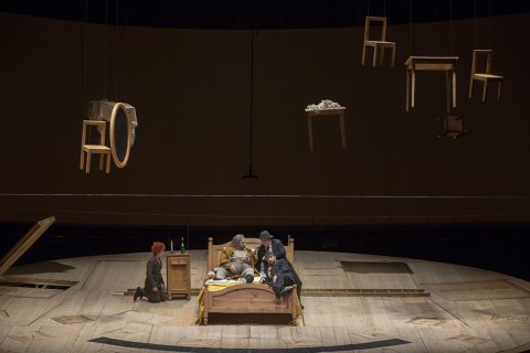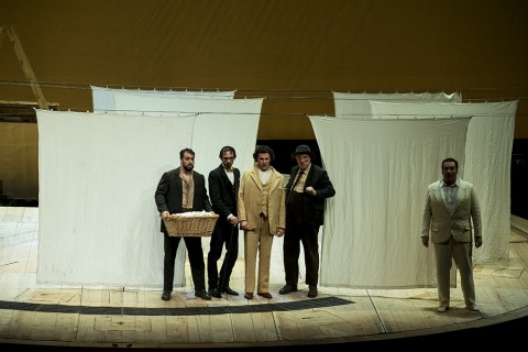L’amore incondizionato verso la psicologia dei caratteri Shakespeariani, al di là delle speculazioni che si fanno spesso sulla sua reale esistenza, ci porta inevitabilmente ad amare ancor più i suoi personaggi allorquando incontrino la genialità del Signor Giuseppe Verdi, come nel caso dell’immenso Falstaff che sta andando in scena in questi giorni al Lirico di Cagliari. Con uno spettacolo lineare e senza ricercare chissà quale significato nascosto nella drammaturgia, Boris Stetka realizza lodevolmente la regia ideata da Daniele Abbado esponendo esattamente quello che serve in scena, dando a ciascun personaggio ampio spazio per esprimersi e caratterizzandoli dal trucco fino ai costumi azzeccatissimi di Carla Teti . L’impianto scenico di Graziano Gregori si foggia fondamentalmente di una piattaforma che viene adibita di volta in volta a luogo in questione. Gli arredi piccoli scendono dall’alto ed un intreccio di fili consente quindi lo spostamento dei vari elementi durante la rappresentazione. Il tutto si svolge in modo aggraziato, lineare, con piccoli accorgimenti che mettano in risalto lo stato d’animo dei protagonisti in scena. Complice anche il gioco luci di Luigi Saccomandi. Fantastico pensare al paffuto Falstaff mentre indossa un completo bianco con ombrellino mignon pronto a pavoneggiarsi (e rendersi ridicolo) davanti alla bella Alice; il buio intorno e le luci puntate su Ford intensificano la sua rabbia nello scoprire l’appuntamento (finto) della moglie con Sir John, il continuo andirivieni delle comari di Windsor mentre interagiscono ne mette in risalto l’aspetto cicaleggiante, e così via tante piccole accortezze per ogni personaggio costruito in bell’accordo tra regia, luci e costumi, su una scena dunque essenziale ma estremamente funzionale. Insomma uno spettacolo ben costruito e garbato che lascia tutti a proprio agio, audience compresa.