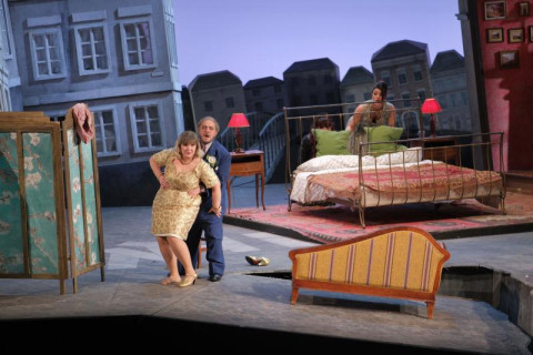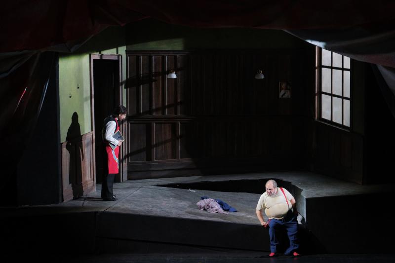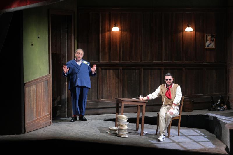 Le scene di Nikolaus Webern inclinano leggermente tutto — muri, prospettive, equilibri — suggerendo un mondo già sul punto di scivolare fuori asse; i costumi di Silvia Aymonino insistono su un british caricaturale ma mai gratuito, tra trench, golfisti e qualche azzardo animalier. Poi arriva il finale, con le luci di Fiammetta Baldiserri, e la trasformazione funziona davvero: la casa resta, ma si trasfigura, e la quercia-lampadario è una trovata che ha il raro pregio di sembrare inevitabile una volta vista. Spirei dirige gli attori con mano sicura, senza lasciarli mai a galleggiare: i tempi sono precisi, i rapporti leggibili, la macchina comica gira con fluidità. Le comari, soprattutto, emergono finalmente come tre figure distinte e non come un blocco unico: Marta Mari è un’Alice brillante, padrona del gioco e musicalmente rifinita; Marianna Mappa tratteggia una Meg con una malizia ben calibrata; Anna Maria Chiuri evita la macchietta e costruisce una Quickly concreta, più donna che funzione, con un fraseggio saporito e ben proiettato. Al centro, Marco Filippo Romano affronta Falstaff con intelligenza e senso della misura. Il lavoro sulla parola è evidente, sempre a fuoco; la linea di canto è solida, omogenea, ben sostenuta. Non cerca scorciatoie comiche né indulge in effetti facili: preferisce costruire il personaggio per accumulo, per dettagli, per piccoli scarti. Ne risulta un Falstaff convincente per coerenza più che per eccesso, anche se ancora un poco trattenuto sul versante più amaro, quello che lo trasforma da puro motore comico a figura davvero crepuscolare. Poi entra Luca Michieletti e la temperatura sale di colpo. Non tanto — o non solo — per la qualità vocale, che resta salda, ben appoggiata, rifinita nel fraseggio, quanto per una presenza scenica che ha qualcosa di istintivo e insieme perfettamente controllato. Michieletti è, nel senso più pieno, un animale da palcoscenico: occupa lo spazio, lo piega, lo organizza attorno a sé. Il suo Ford è nervoso, contratto, attraversato da scatti improvvisi e da una tensione continua che non si scarica mai del tutto. “È sogno o realtà?” diventa così un momento di teatro vero, non soltanto cantato ma vissuto, con una gestione del crescendo emotivo e musicale che tiene insieme voce e corpo senza mai perdere il controllo. E ogni sua entrata lascia un segno, anche quando non canta. Molto valido anche il resto della compagnia, che si muove compatta e credibile: Marco Ciaponi è un Fenton lirico, pulito, dal canto elegante e dalla presenza scenica disinvolta; Vittoriana De Amicis è una Nannetta vivace, ben inserita nel contesto registico, anche se la voce appare ancora un poco leggera per imporsi davvero; Matteo Macchioni e Mariano Buccino costruiscono una coppia di Bardolfo e Pistola ben assortita, precisa nei tempi e nel gioco scenico; Blagoj Nagoski disegna un Cajus efficace, senza forzature. In buca, invece, le cose faticano a decollare. Giuseppe Grazioli dirige con correttezza ma senza trovare una vera linea interpretativa: tempi prudenti, colori poco differenziati, una generale tendenza all’uniformità che finisce per appiattire la partitura. E non è solo una questione di carattere: si avverte anche una certa disattenzione d’insieme, con piccoli scollamenti e qualche incertezza. L’interludio che apre il terzo atto, in particolare, dovrebbe creare un’atmosfera sospesa, ambigua, quasi notturna; qui procede invece con fatica, inciampando in più di uno scivolone e perdendo proprio quella qualità insinuante che prepara la burla finale. Il coro preparato da Roberto Gabbiani è ordinato e puntuale, soprattutto nel terzo atto, senza però andare oltre una corretta funzionalità. Il risultato è uno spettacolo che vive soprattutto di palcoscenico: idee chiare, ritmo, attori guidati con intelligenza, momenti che funzionano davvero. Teatro quasi esaurito e festoso con tutti gli interpreti.