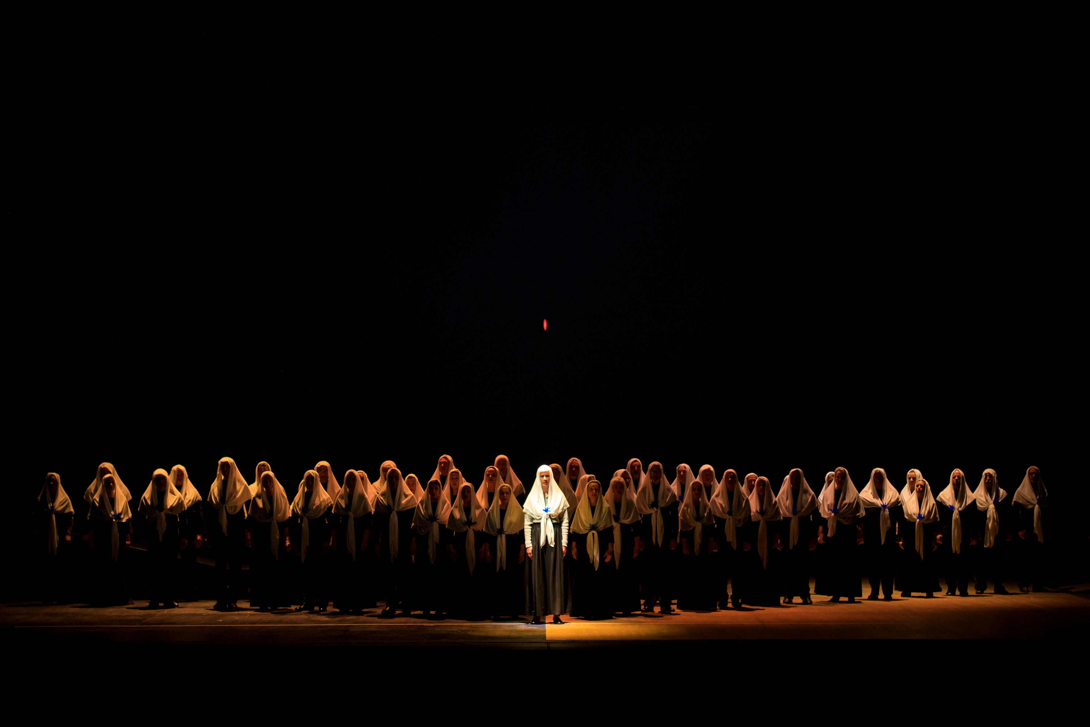 Per il resto si sprofonda nella noia più decisa, dove non succede nulla e dove la penombra perenne stimola la pennichella aiutata dalla recita pomeridiana in una città rovente. Curioso poi vedere il coro (perfettamente istruito da Gea Garatti Insini) in crisi di identità, con continui cambi di costume che spaziano dalle monache velate (uomini e donne) , agli abiti moderni, per finire tutti velati di nero.