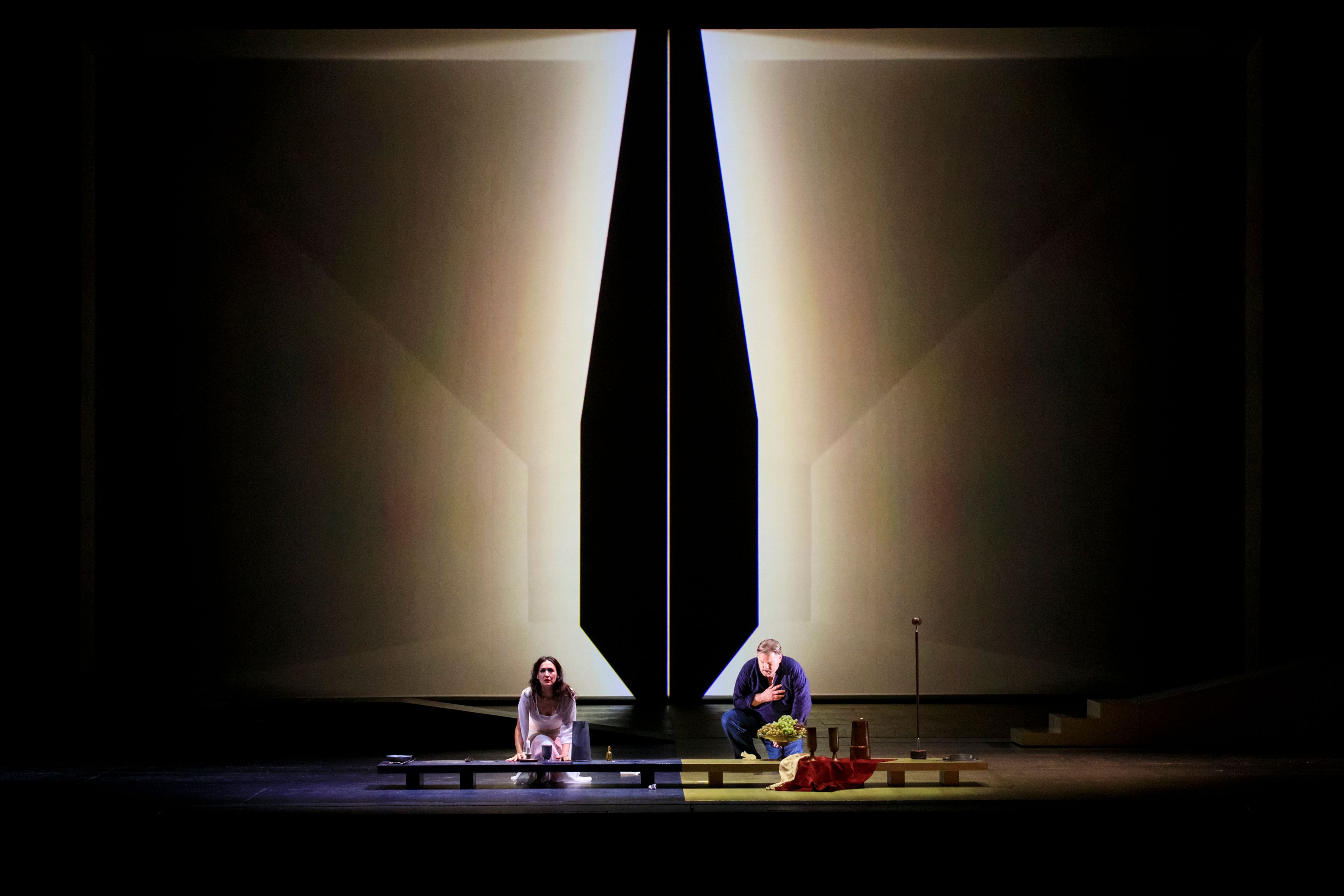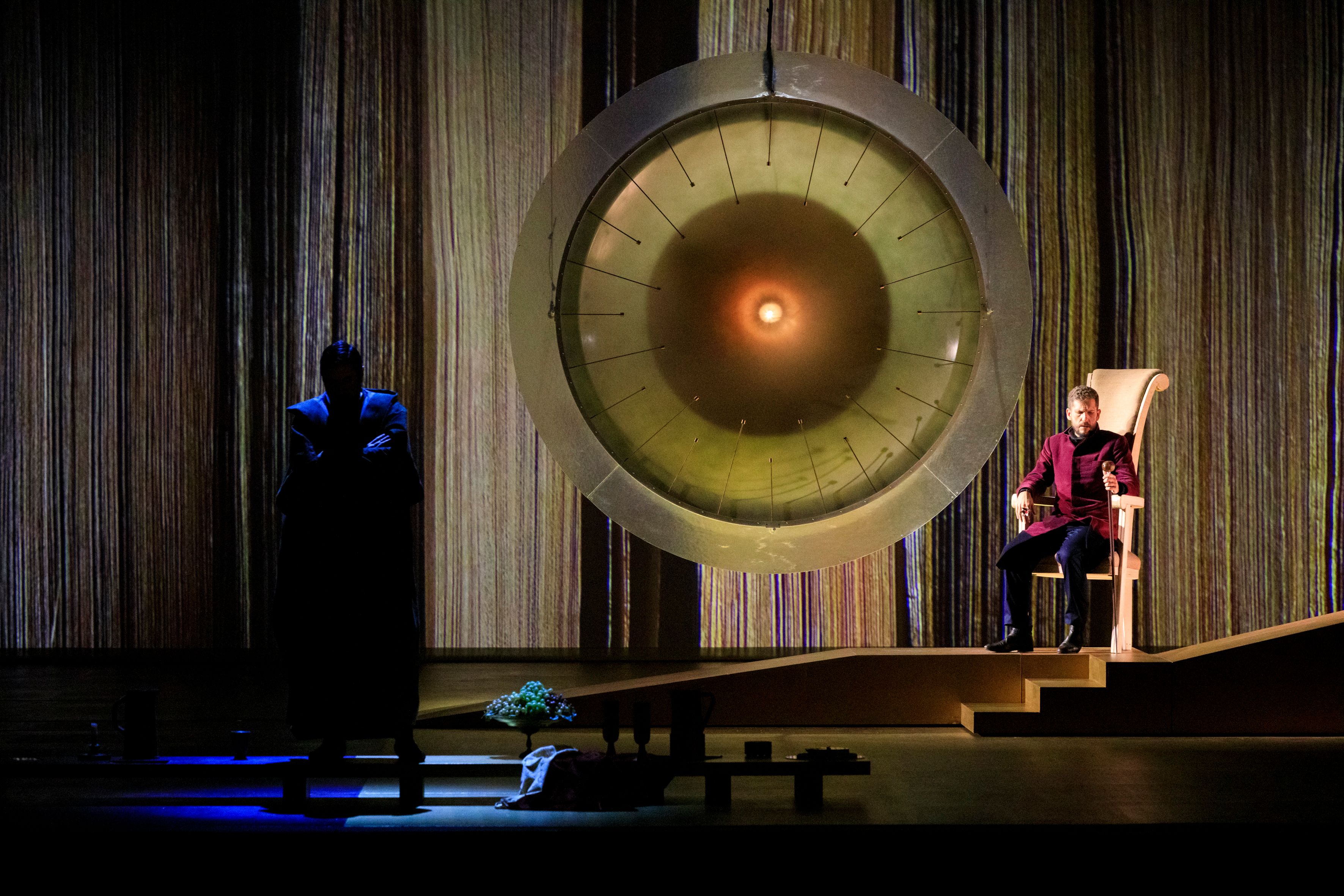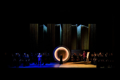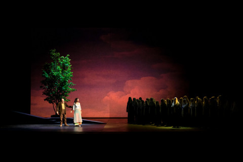 “Approcciandomi a questa per me nuova esperienza, il primo pensiero è stato quello per la musica di Verdi, per la voce dei cantanti: ho lavorato al fine di mantenere il giusto equilibrio": è con questo pensiero che il progettista e artista della luce ravennate Mario Nanni (in arte 'marionanni'), firma per la prima volta regia, scene, costumi e luce di un'opera lirica. La luce soprattutto, in armonia con la musica e il canto, avrebbe dovuto guidare tutte le arti e a raccontare lo spettacolo e le emozioni dei protagonisti secondo le intenzioni dell’artista. Sarebbe stata poi l'uso della luce nella pittura rinascimentale a ispirare le "scenografie di luce" create per l'opera e colori e dettagli dei costumi. A noi è parso di vedere soltanto delle interessanti installazioni visive (come una grande lampada centrale che diventa sole, cielo e si trasforma in funzione dei vari momenti dell’opera) e delle immagini oniriche bidimensionali, pochissimi e più che altro simbolici, gli elementi di scena (un albero, un tavolo basso, un trono).
