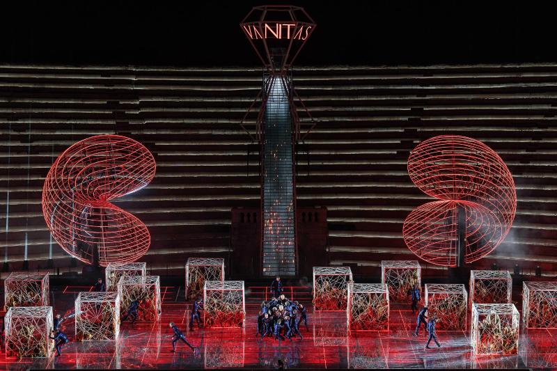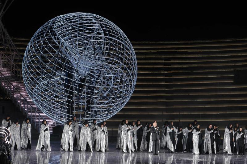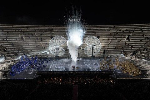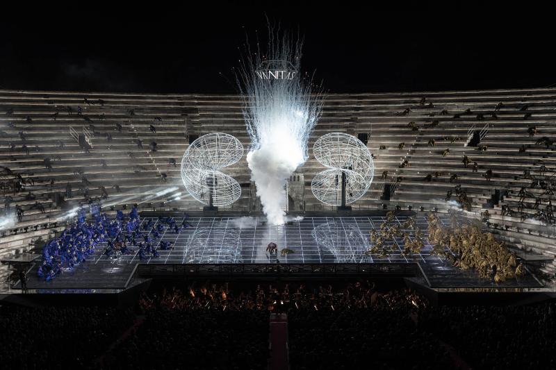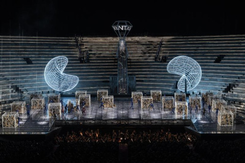 L’Arena di Verona ha inaugurato la stagione estiva con Nabucco di Giuseppe Verdi, in una produzione firmata interamente da Stefano Poda, autore di regia, scene, costumi, luci e coreografia. Uno spettacolo che ha sorpreso il pubblico per il suo taglio spiccatamente televisivo e per una concezione scenica tesa a ordinare con eleganza e precisione geometrica le masse artistiche, in un movimento perpetuo e fluido, perfettamente sincronizzato con la musica. Il risultato visivo è di grande impatto, capace di restituire una monumentalità astratta e sospesa, in cui il popolo diventa parte viva dell’architettura drammatica.