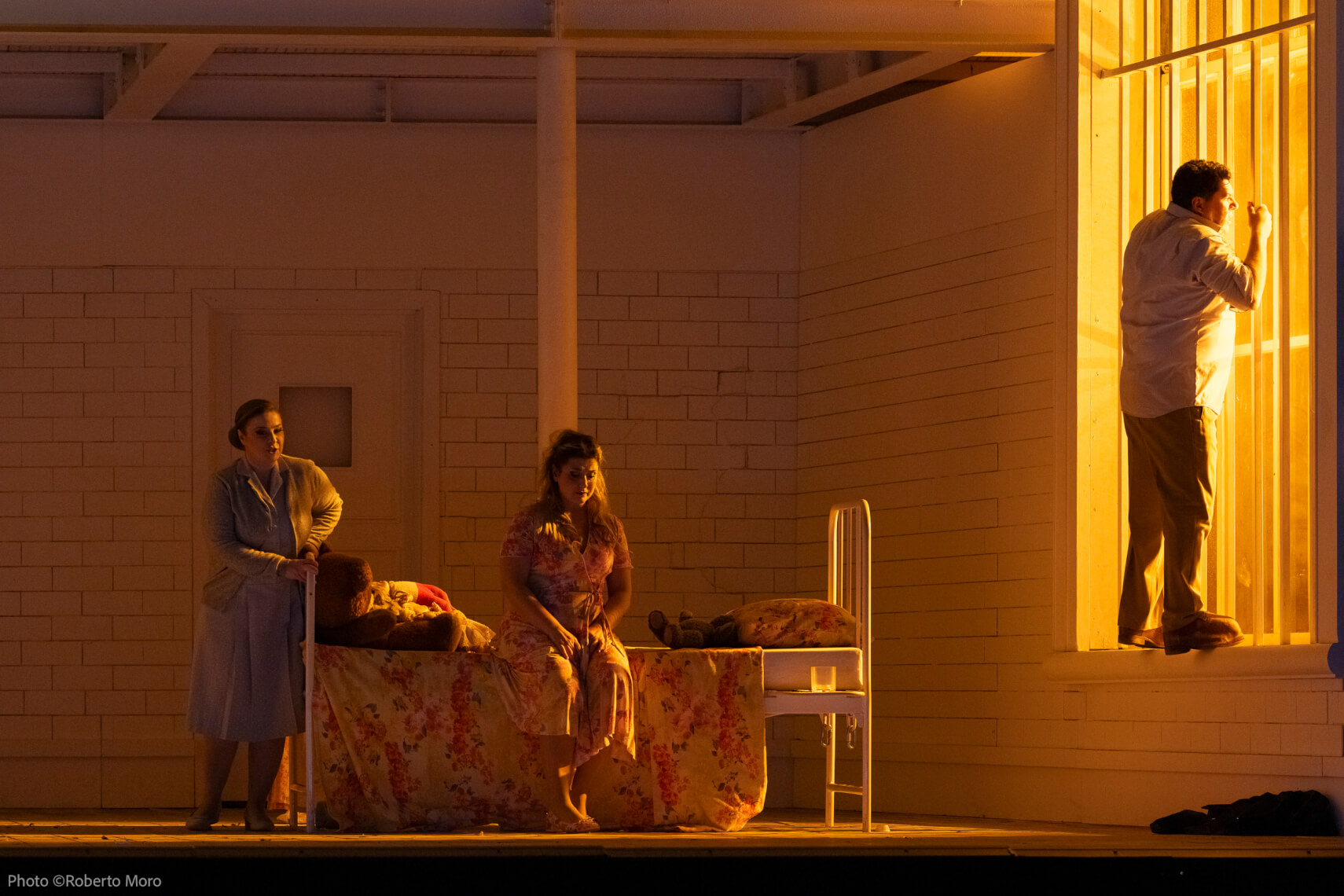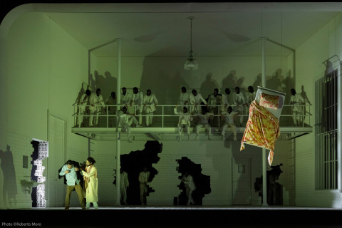 Dal punto di vista scenografico, l’azione si svolge in una tetra stanza d’ospedale dalle pareti squarciate, che evoca un senso di claustrofobia e oppressione. I costumi, prevalentemente in tonalità neutre, amplificano questa atmosfera, eccezion fatta per gli abiti più vivaci di Rigoletto, Gilda e Monterone. Particolarmente efficace risulta l’uso delle luci, prevalentemente fredde, che assumono tonalità verdi durante il coro “Duca, Duca! L’amante fu rapita a Rigoletto”, creando un effetto straniante di forte impatto visivo.