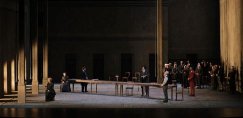 Questa potenzialità è stata ribadita al Teatro Filarmonico di Verona, dove Stiffelio è andato in scena per la prima volta nella sua storia. L’ allestimento proveniente dal Regio di Parma, ideato da Francesco Calcagnini con la regia di Guy Montavon, si concentra tutto su un’estetica sobria e monocromatica: ambienti essenziali, pochi elementi di scena e un grigio dominante sia nelle scenografie che nei costumi di Francesco Calcagnini. La regia rigorosa e composta si ravviva grazie a un sapiente gioco di luci fredde, che accompagna i momenti più intensi. L'ambientazione, rigorosa e ridotta all’essenziale, si trasforma con pochi dettagli nei vari luoghi della storia. Un'atmosfera soffocante e chiusa avvolge il dramma, rispecchiando la rigidità della piccola comunità protestante, dove dominano tinte scure: grigi e neri scandiscono ogni figura, risaltando sullo sfondo. Spiccano tra questi il rosso aragosta della redingote del seduttore, Raffaele, e il bianco dell’abito di Lina, simbolo di purezza nell’ultima, fugace apparizione. In sintesi, uno spettacolo essenziale nei gesti, ma quantomeno chiaro nello svolgimento d’una vicenda non facilissima da afferrare.
