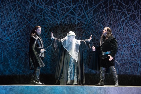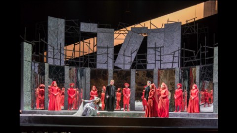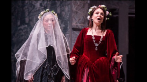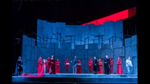 Che ci troviamo nel diciassettesimo secolo e all’epoca di Oliver Cromwell lo si evince dai raffinati costumi dello stesso Esposito che tinge di scura austerità tutti i protagonisti ad eccezione di Elvira, sposa in rosso porpora ma poi calata in veste bianca nelle scene successive a simbolo della sua purezza incontaminata. Il rosso torna nello stuolo di castellani e damigelle, probabilmente riflesso della passione che arde nei cuori dei due giovani sposi appartenenti alle opposte fazioni di Puritani e Stuart. Il setting predisposto da Rinaldo Rinaldi e Maria Grazia Cervetti è invece piuttosto asettico, volto ad esemplificare sensazioni e moti d’animo piuttosto che situazioni concrete. In tal senso giocano ruolo essenziale le luci intense studiate da Andrea Ricci.