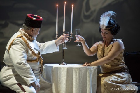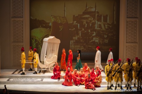 Driver ha pensato di spostare agli inizi del Novecento la vicenda in cui la protagonista è in realtà una spia delle forze alleate contro il famoso Atatürk che fondò la Repubblica turca, di chiare tendenze occidentaliste e pertanto affascinato dalla bella Konstanze, che nonostante sia fidanzatissima, non disdegna invero le attenzioni dell’accattivante Pascià che per averla è costretto a rapirla. Di ispirazione hollywoodiana, assistiamo ad una sorta di lungometraggio d’altri tempi, con immagini in bianco e nero e le classiche scritte didascaliche dei primi film muti. Queste elaborazioni sono a cura di Lorenzo Curone, mentre le garbate ed essenziali scene sono di Guia Buzzi, che cura anche i costumi per la verità non sempre appropriati nell’esaltare le diverse figure degli interpreti. Roberto Gritti confeziona un impianto luci piuttosto funzionale alle scene. I dialoghi sono tradotti in italiano per una maggiore fruibilità al pubblico locale.
