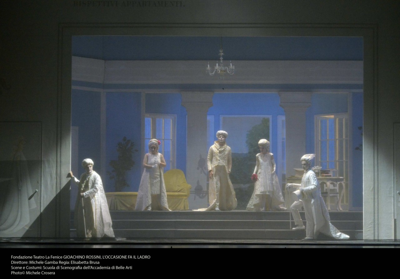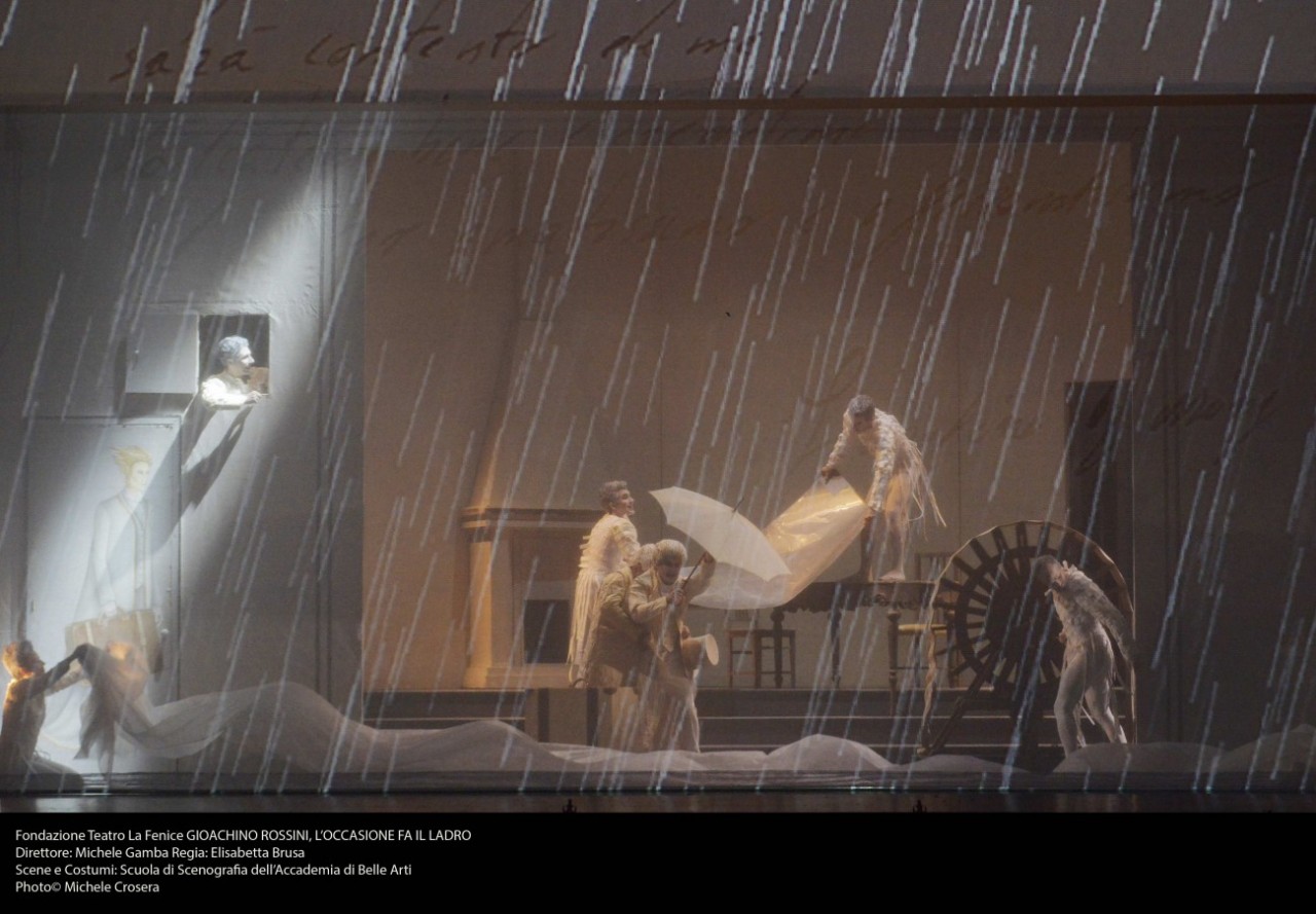 Ritorna a Venezia il fortunato allestimento del 2012 de L’occasione fa il ladro di Rossini, realizzato in collaborazione con la Scuola di Scenografia dell’Accademia di Belle Arti, parte del felice progetto di valorizzazione dei giovani con l’allestimento delle cinque farse rossiniane composte in gioventù dal pesarese proprio a Venezia. La regista Elisabetta Brusa crea un ambientazione molto ovattata, con i personaggi avvolti dalle pagine del libretto le cui indicazioni in cima sormontano le illustrazioni rappresentate da ciò che accade in scena. Come un libro sfogliato dallo spettatore, le scene si susseguono come girassimo le sue pagine, che sono rese patinate dal telo che copre il palco in proscenio, utile naturalmente anche per le proiezioni di elementi utili allo spettacolo. Deliziosi ed elegantemente arredati gli interni creati per l’albergo all’inizio e successivamente per la casa della marchesa. Forse ridondanti i ballerini e mimi che fuori e sopra il palcoscenico sembrano essere più un ornamento in costume che personaggi utili alla rappresentazione. Il bianco è il colore predominante nei costumi, che sottolineano l’atmosfera patinata dell’allestimento.