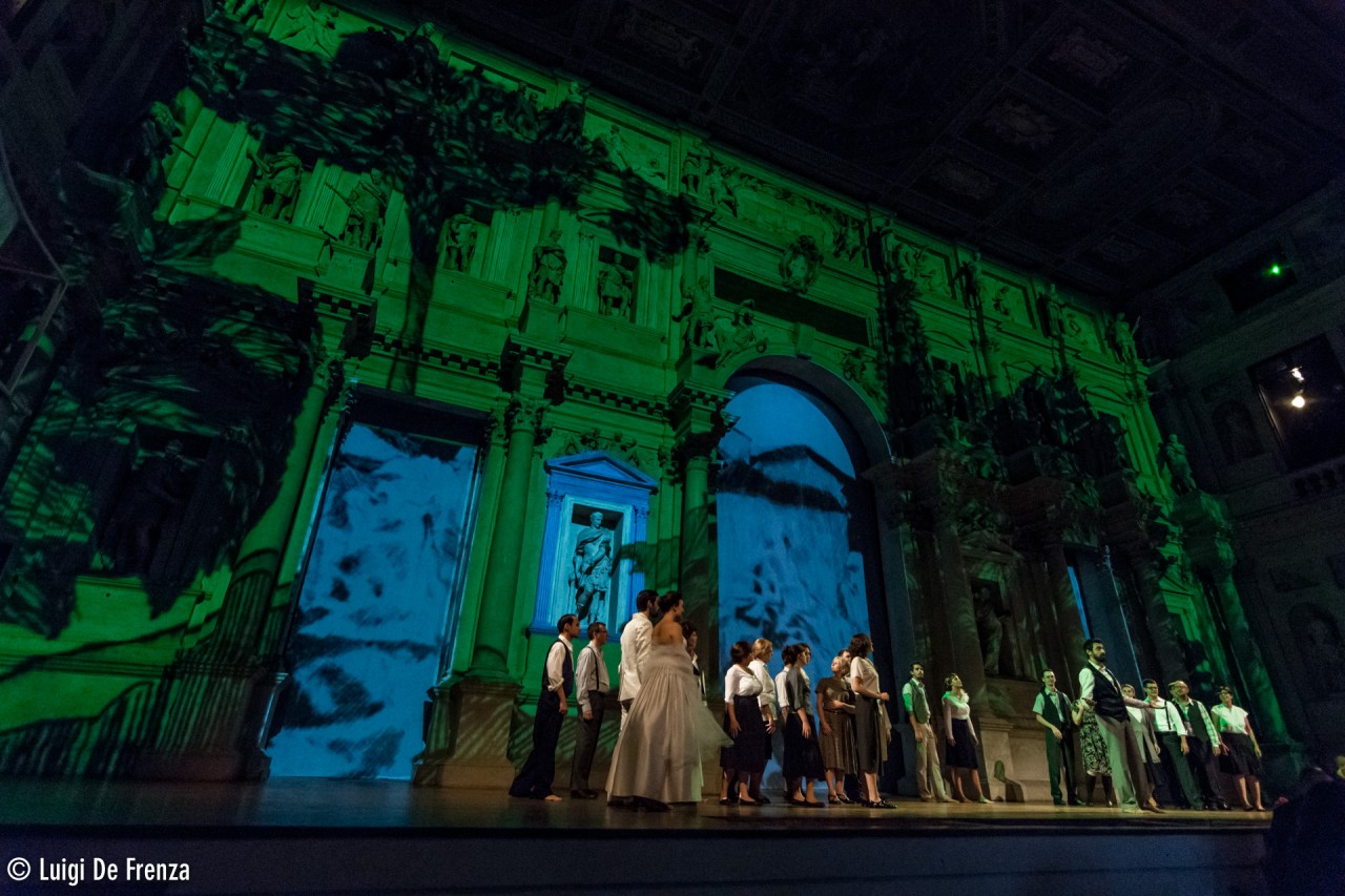 L’Orfeo di Castello che ne cura la regia si muove verso un orizzonte molto ampio. Non solo Orfeo in quanto tale, ma anche simbolo di ogni uomo e soprattutto di tanti vicentini che hanno vissuto gli splendori della città e la sua rovina durante le due guerre mondiali. In tal senso si spiega l’ispirazione scenografica alle ‘vedute’ che Neri Pozza utilizzò proprio negli anni bellici, a testimonianza di quanto la città berica avesse sofferto e come sia poi riuscita a risorgere. Orfeo vive il suo dramma ma cerca soluzioni, invoca le divinità, trova sollievo nell’immortalità e nel poter vedere risplendere la sua amata in cielo. Se non immediatamente fruibile è il paragone, l’effetto che queste vedute creano sulla scena fissa del teatro è affascinante. Grazie alla collaborazione con la Zebra Mapping, che ha di fatto realizzato il progetto informatico sulle scenografie virtuali curate da Mauro Zocchetta, il Teatro Olimpico si trasforma in palcoscenico ideale e mentale, concreto ma fantastico, ed ancora una volta efficacie. Riusciamo così a vedere anche paesaggi naturali che si innestano perfettamente tra le architetture palladiane, con chiaro-scuri d’effetto che risaltano e non nascondono ciò che rende unico il teatro cittadino. Chiara Casarotto completa la magia con le luci studiate ad hoc nel fare risaltare ciò che accade in scena. Sul palcoscenico pochi elementi essenziali e molta libertà agli interpreti, che però non hanno saputo sfruttare tale opportunità a pieno. Elemento aggiuntivo è il mimo che il regista vuole come immagine statuaria di un Orfeo in cerca del proprio io in contrasto o forse conflitto con l’amore per Euridice, vista più come musa ispiratrice del suo canto che dei suoi sentimenti.