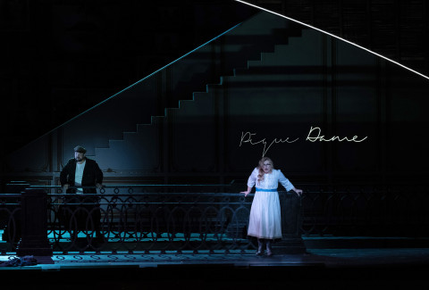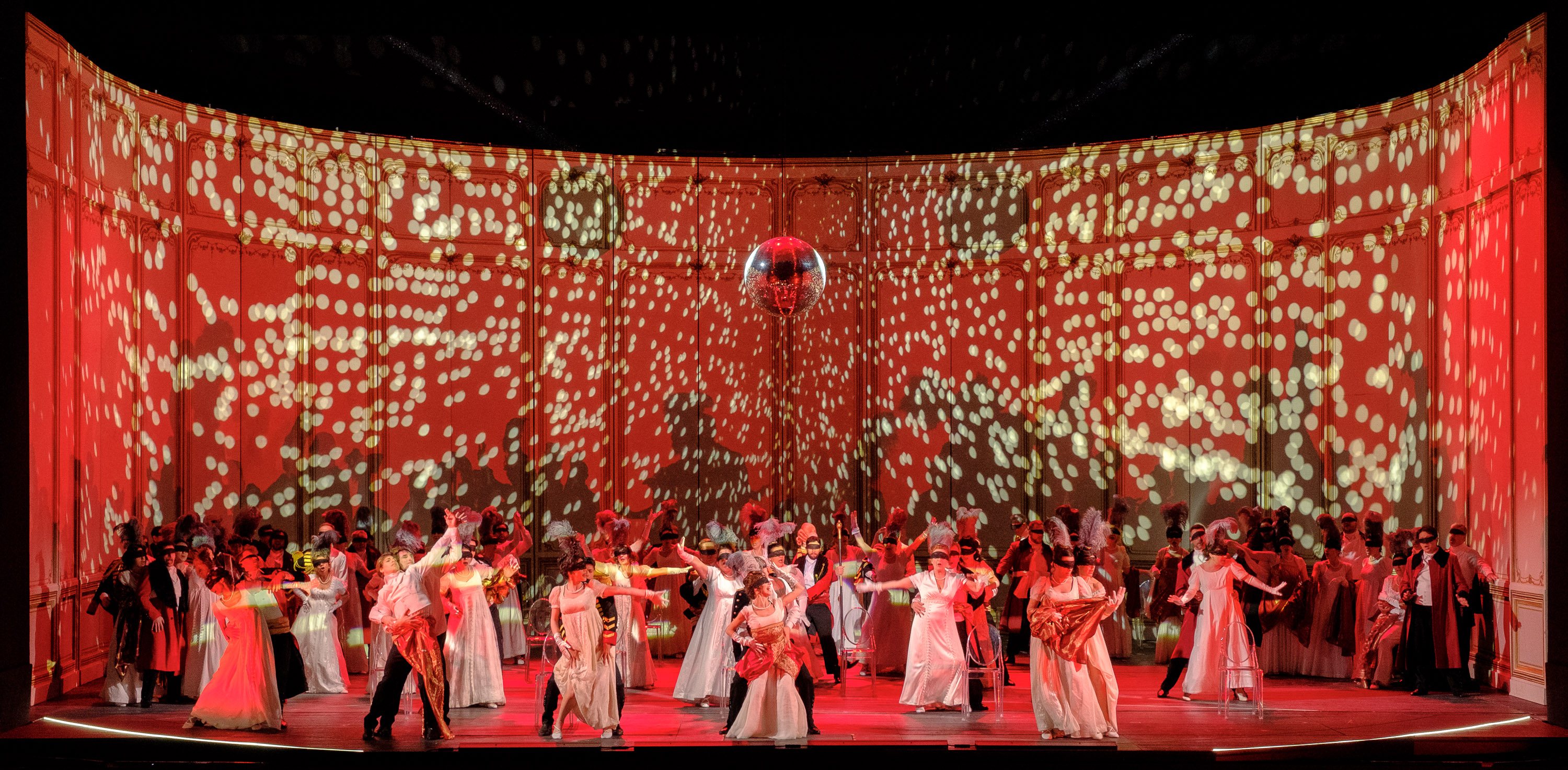 Lo spettacolo di Sam Brown è qui ripreso da Sebastian Häupler con le particolari coreografie di Ron Howell riprese da Angelo Smimmo. L’ambientazione scenica di Stuart Nunn sembra essere un ponte tra il passato originale del libretto ed una contemporaneità dei temi trattati, in modo molto schematico grazie a geometrie che si intrecciano ad elementi classicheggianti, nel gioco di luci piuttosto tristi ed asfissianti di Linus Fellbom. Ma in generale non si capisce bene dove ci troviamo e sembra anche che in taluni momenti gli interpreti siano lasciati scegliere come comportarsi con esiti non felicissimi. I costumi dello stesso Nunn non sempre valorizzano gli interpreti o i ballerini.