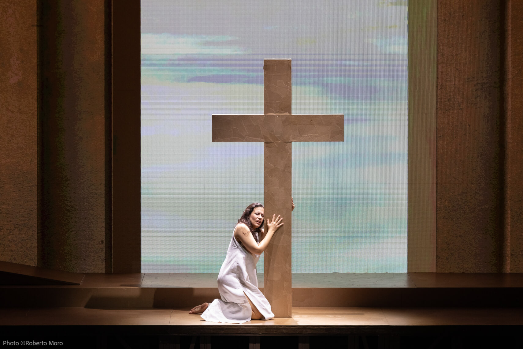 È questo mistero che avvolge la figura di Maria ad aver affascinato il regista Pier Luigi Pizzi, ancora in forma e felice sul palco al termine dello spettacolo, fautore di una regia rispettosissima del libretto ma dal sapore non stantio, con l’uso della tecnologia per gli sfondi e gli effetti visivi in generale, ed una delicatezza estrema nel trattare tanto le scene più sensuali quanto naturalmente la sofferenza nella consapevolezza del peccato e nel desiderio di espiazione, con piccoli espedienti scenici intelligenti e funzionali. Certo non veniamo stupiti da colpi di scena particolari e lo spettacolo per sua natura stessa necessita di un particolare attenzione, che in verità il pubblico ha mantenuto più che in altre rappresentazioni diremmo ‘popolari’, ma si tratta di un lavoro incentrato più sui sentimenti che sull’apparenza e soprattutto vi è una sorta di sacralità che ovatta lo spettacolo nella sua interezza. I protagonisti sono soprattutto attori in questo contesto, laddove la parte di Maria è supportata anche dall’ottima ballerina Maria Novella Della Martira, alter ego del soprano che con eleganza esprime tanto la sensualità del primo episodio, quanto la remissione con la purezza del bagno purificatore successivamente. Fabio Barettin illumina letteralmente con luci d’impatto le scene poste in essere.