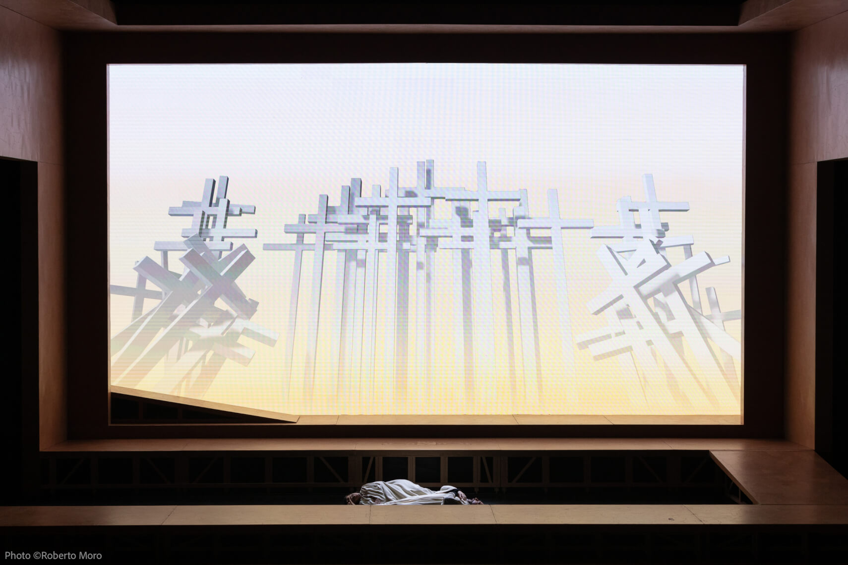 Una altra chicca cui non potevamo sottrarci è Maria Egiziaca di Respighi in scena in questi giorni al teatro Malibran di Venezia, la cui prima è stata venerdì scorso. Un’opera brevissima, nei suoi settanta minuti circa di esecuzione, un ‘trittico’ musicale diviso in tre episodi, come le tavole dipinte che si trovavano nelle chiese medioevali e non solo, che racchiude in sé tanto echi di note arcaiche, con i cori gregoriani molto amati da Respighi e la religiosità che profende dal secondo episodio in poi, quanto un tocco di modernità con suoni che spesso costringono ad uno sforzo particolare gli interpreti, i cui stati d’animo sono protagonisti più della musica stessa. Fu nel 1932 che questa composizione debuttò a New York in forma di concerto, come molti sanno diretta dal compositore stesso in sostituzione di Toscanini. In forma scenica fu eseguita successivamente in Italia per poi scomparire via via dai cartelloni teatrali. Ma la Fondazione Teatro La Fenice la riprende per questa stagione con uno spettacolo garbato, dove in poco più di un’ora riviviamo la nota leggenda medievale narrata da Domenico Cavalca, in cui la protagonista Maria da donna di malaffare, pronta a vendersi fisicamente per un passaggio in nave che la allontani da Alessandria, passa alla santificazione attraverso l’illuminazione divina ed una vita passata ad espiare colpe tra privazioni e stenti nel deserto.