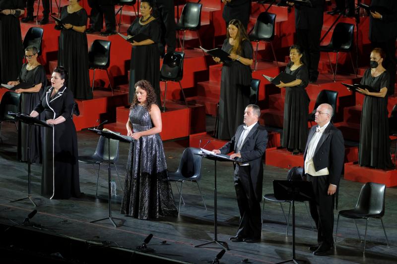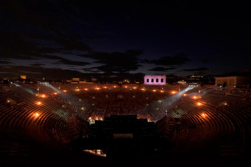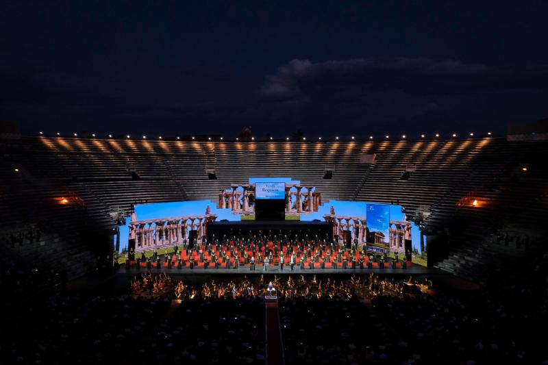 Con l'annuncio della dedica della serata alla prematura scomparsa del regista Graham Vick, autore di una memorabile quanto contestatissima Traviata nell’anfiteatro veronese, è iniziata l’esecuzione della Messa da Requiem di Giuseppe Verdi, organizzata dalla Fondazione Arena di Verona, che ha visto scorrere sui giganteschi led walls di sfondo, immagini del Parco Archeologico di Paestum e di Pompei.