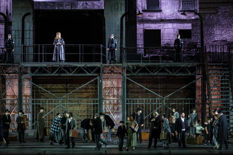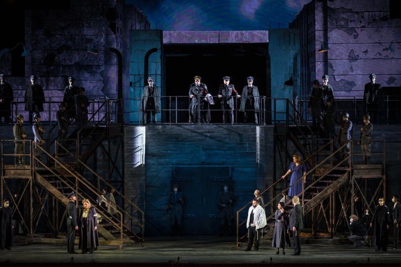 Nabucco non tradizionale quello visto in Arena, qualcuno direbbe anche finalmente, ove parte importante è costituita ancora dai ledwall per gli effetti scenografici ed una idea che non porta le solite masse ingombranti con decine di comparse in tutto lo spazio disponibile (anche per prevenire assembramenti), il coro sempre a sinistra del palco sui gradoni e ballerini e figuranti mascherati per proteggersi. Questa volta però non si è aperto solo il portone dei magazzini della Fondazione per riciclare costumi e idee, ma si è cercato di trovare un filo narrativo più vicino ai giorni nostri per raccontare la storia degli schiavi ebrei ed il re di Babilonia Nabucodonosor. Chiunque abbia firmato la regia, che ancora una volta non è indicata sui programmi, ha trovato un facile parallelo con gli Ebrei deportati della Germania di Hitler e dunque il potente re diventa un crudele gendarme nazista della Seconda Guerra Mondiale. Tutti i personaggi ruotano dunque intorno a questa figura e trovano una corrispondenza con persone e storie di quel periodo che possiamo comunque solo ipotizzare mancando note specifiche degli autori. La narrazione in verità è un po’ lenta ed i cambi scena se pur minimi richiedono tempo e sono resi anche difficili dal buio circostante. Sul finale il parallelo si chiude con la liberazione degli ebrei in procinto di entrare nelle camere a gas ed il pentimento del Nabucco tedesco. Le immagini che accompagnano la narrazione sono stavolta del ‘Museo Nazionale dell’Ebraismo italiano e della Shoah’ di Ferrara.