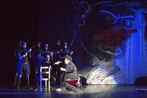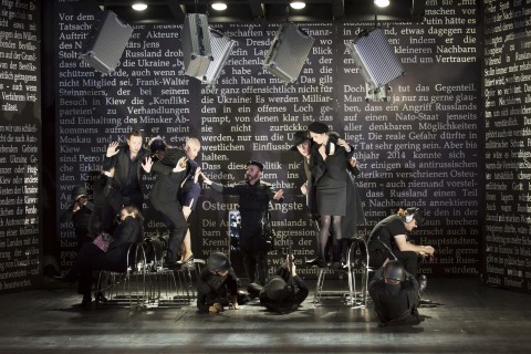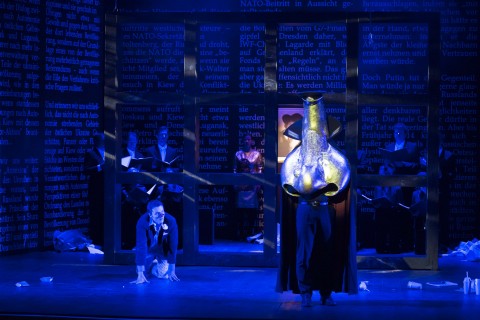 Perdere il naso, che sia la propria credibilità, il fiuto per gli affari oppure per le questioni politiche, come nel caso del protagonista, è sventura che può capitare a chiunque e probabilmente già Gogol nella sua novella e dunque Šostakovič, avevano colto questo aspetto nella società di allora che quanto mai si adatta ai giorni nostri. Così il regista Matthias Oldag camuffa anche il naso del coro ed impone agli interpreti dei ritmi serratissimi di azione in cui si susseguono le scene, come a dire che la vita è una corsa e se non si ha la capacità di starle dietro si rischia letteralmente di ‘perdere i pezzi’. Dai palchi alla platea tutto il teatro è parte della scenografia, non basta ad esempio il solo palcoscenico per inseguire il povero barbiere Ivàn Jakovlevič che corre a disfarsi del naso che la moglie ha trovato nell’impasto del pane, dai palchi il coro e gli altri personaggi entrano ed escono avvolgendo il pubblico in ascolto. Forte anche di effetti luce azzeccati di Norbert Chmel, le scene molto schematiche di Frank Fellmann accolgono in modo efficacie le azioni previste: uno spazio squadrato il cui sfondo a colonne stampate di articoli si adatta sia per la redazione del giornale che con le dovute modifiche alla casa di Kovalëv, alla stazione di posta, e così via. Imponente il volto dal naso cancellato su sipario chiuso ad introdurre il tema di fondo.
