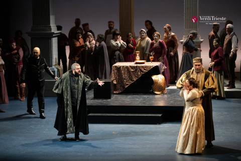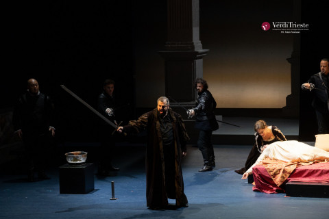 Giulio Ciabatti ambienta la vicenda in una grande stanza blu incorniciata da grandi colonne al cui centro è disposta una pedana multifunzionale: una scena essenziale, molto tradizionale e, aggiungerei, rassicurante per il pubblico triestino. Al solito i movimenti sono curati e ben studiati, abbastanza vari e le dinamiche fra i personaggi riescono ad emergere, ma non sono sufficienti a colmare il vuoto fisico e soprattutto teatrale sul palcoscenico. Funzionali i costumi di Margherita Platè e calibrato il disegno luci di Fiammetta Baldiserri.