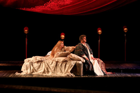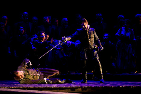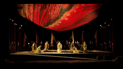 Dopo una lunga pausa dovuta come tutti ormai sanno all’emergenza pandemica, lo spettacolo dell’Otello verdiano pensato per il PalaDozza prima del secondo lockdown del 2020 vede finalmente la luce al Comunale di Bologna, dove è stato riadattato e ripensato, avendo a disposizione spazi e geometrie completamente diverse. Gabriele Lavia con le scene di Alessandro Camera pone in essere soprattutto il dramma interiore dei personaggi che di conseguenza, secondo la sua visione, ed anche considerando le innumerevoli restrizioni sceniche del periodo in cui era stato concepito l’allestimento, non hanno bisogno di particolari orpelli materiali nell’ esprimere la propria personalità immergendosi profondamente nei rispettivi drammi, sapientemente esaltati da una cornice di effetti luce indovinati e puntuali. Dunque in scena accade ciò che basta senza esagerare, è il contesto che unitamente alla musica verdiana contorna uno spettacolo di per sé sobrio e che non disturba, non modifica il libretto e tutto sommato risulta garbato, con quell’unico telo che calato dall’alto ed appunto illuminato a dovere ha il compito di trasformarsi nei diversi ambienti che sta allo spettatore immaginare. Delle tavole su cui muoversi ed alcune poltroncine antistanti fanno pensare ad una prova teatrale come visto tante volte ma che a quanto pare funziona sempre. Meravigliosi i costumi di Andrea Viotti, ricchi ed assolutamente appropriati al contesto storico shakespeariano.