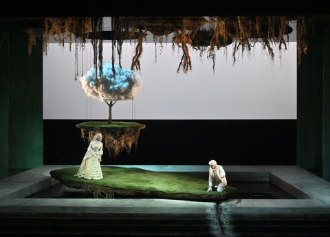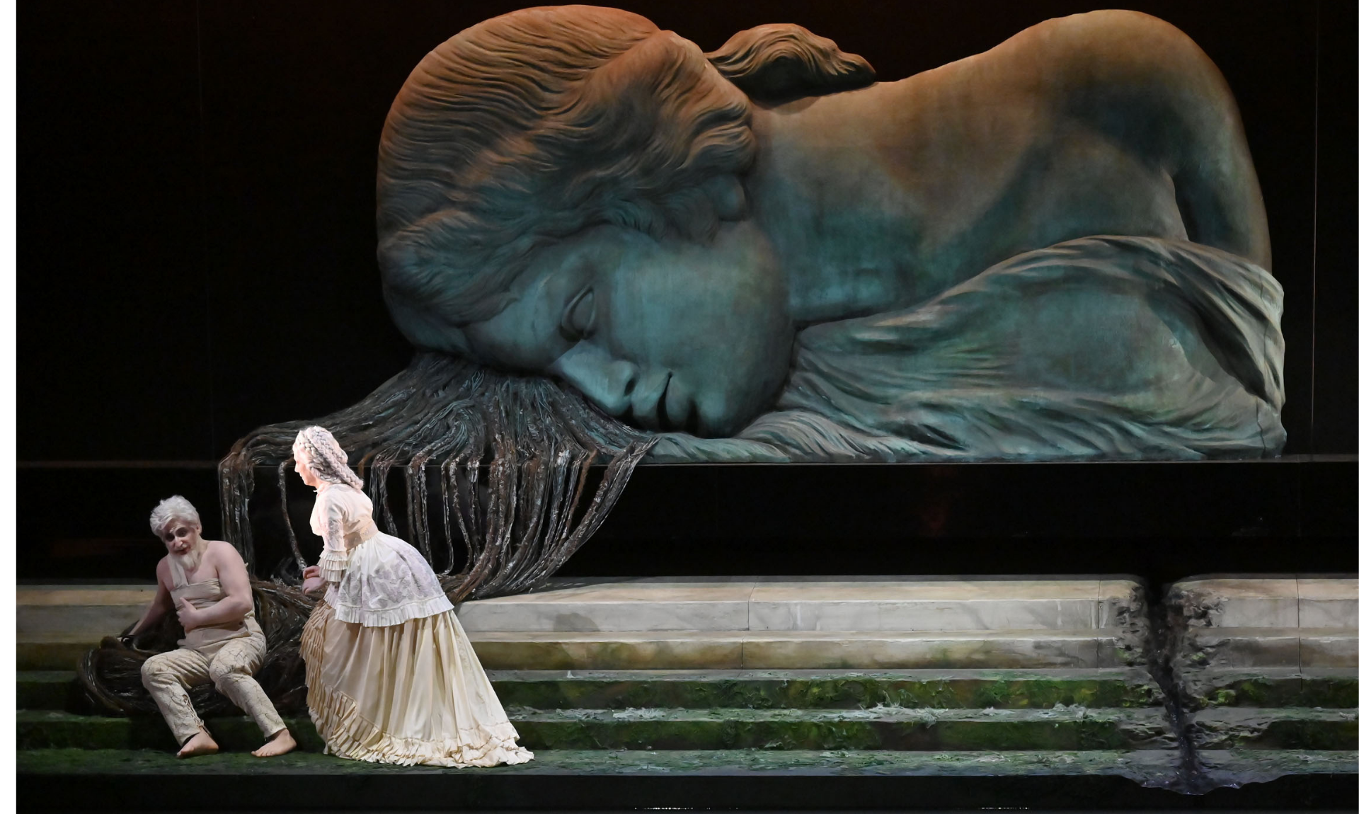 Enkelejda Shkoza come Geneviève ha messo in mostra una dizione perfetta e un suono robusto mentre recitava la lettera di Pelléas ad Arkel. All'incapace vecchio re Arkel la voce del veterano Vincent Le Texier ha dato suoni terreni e dolorosa tristezza. Perfetta vocalmente ma anche fisicamente Silvia Frigato nella parte del piccolo Yniold. Il nuovo allestimento, nato a Parma e coprodotto con Fondazione Teatri di Piacenza , porta la firma del team creativo André Barbe e Renaud Doucet ed è ispirato a “Die Toteninsel” dell’artista simbolista Arnold Böcklin. Barbe & Doucet, assieme alle meravigliose luci curate da Guy Simard (qui riprese da Andrea Ricci) concepiscono un lavoro che si richiama allo Spiritismo tardo ottocentesco, in cui i personaggi probabilmente già morti, sono immersi loro malgrado in un limbo, uno spazio di confine tra ciò che sta sopra la terra e ciò che sta sotto. Dei replicanti che si muovono tra elementi scenici naturali, boschivi e acquatici, figure che evocano cimiteri monumentali, isole semoventi, pannelli e fondali in continuo movimento. Se tutto risulta particolarmente seduttivo dal punto di vista visivo, sembra tuttavia mancare un’idea completa di fondo, risultando alla fine un via vai di fantasmi tra gli altri in ammollo, alla perenne ricerca di una luce che passa continuamente nelle mani dei replicanti sotto forma di sfera luminosa. Un po’ poco sinceramente.