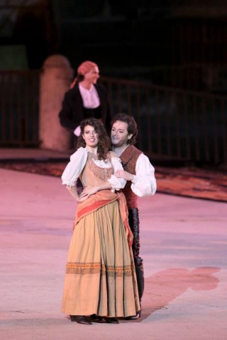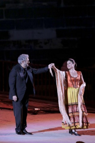 Domingo confeziona uno spettacolo completo di tutto questo e forse più, perché l’elemento umano è ciò che ha sempre fatto la differenza nel suo caso. Stefano Trespidi recupera gli elementi base della nota scenografia di Carmen e su di essa il padrone di casa si alterna a due splendidi e validi colleghi: il soprano Ana María Martínez ed il tenore Arturo Chacón-Cruz. Il programma, illustrato di seguito, offre una ricchissima carrellata delle più celebri arie di questo repertorio, da autori come Gerónimo Giménez, Pablo Sorozábal, José Serrano, Enrique Granados, per citarne solo alcuni. I temi trattati sono ovviamente cari ad un popolo sanguigno come la Spagna: amore, passione, gelosia, tristezza, nostalgia.. Domingo trova una sorta di ritorno alle origini in questo repertorio che gli appare particolarmente congeniale: la voce è chiara, come è e deve essere quella di un tenore, non mostra alcuna fatica, nonostante le oltre due ore di spettacolo, e canta sempre con un fraseggio meraviglioso ed un senso della parola invidiabile. Certo l’amplificazione installata gioca molto a favore di una emissione più rilassata, senza colpire e chiaramente calibrata ai volumi dei microfoni, ma colpisce il senso del palcoscenico sempre vivo in questo interprete che ha come sempre ipnotizzato il pubblico. Bellissima la voce rotonda e calda di Ana María Martínez, soprano duttilissimo, dalle agilità facili tanto quanto i pianissimo, con una presenza scenica prepotente e davvero espressiva nel canto. Stesso dicasi per il tenore Arturo Chacón-Cruz, voce incantevole ed uniforme, ben controllata, preciso ed incisivo nel porsi sul palco.