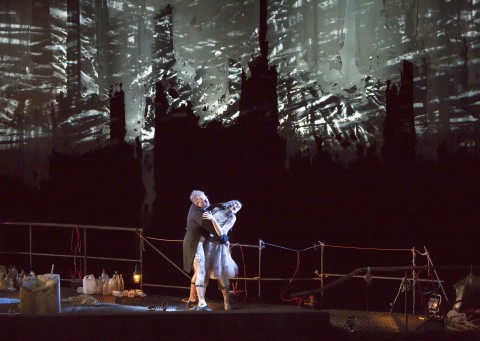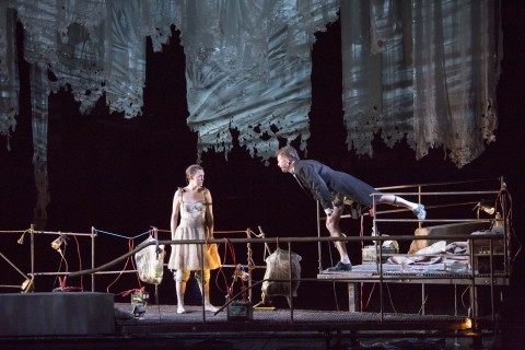Così John Fulljames ambienta questa angosciante prospettiva in un oscuro scenario ideato da Soutra Gilmour, fatto di contrasti luminosi (a cura di Bruno Poet) ed in cui le istallazioni video di Ravi Deepres esemplificano gli stati d’animo dei protagonisti, talvolta con colori accesi, tali altre con elementi che richiamano alla natura ed all’acqua che sembra ribollire. I due attori/cantanti sono decisamente attivi in scena, quasi senza tregua si stuzzicano, si sfidano, si inseguono e si stimolano; le azioni tra loro sono forti ed esplicite quanto lo è il linguaggio utilizzato.