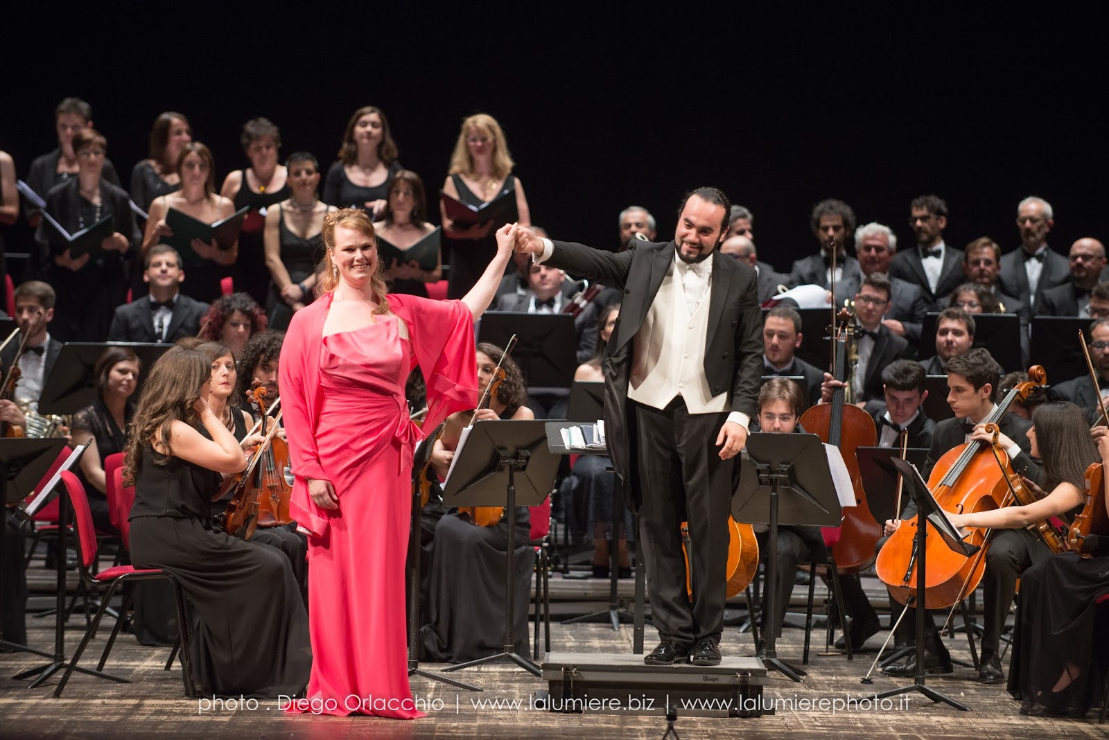 Jessica Pratt si rivela una ospite gradevolissima e sorprendente: con una serata che l’ha vista crescere in scioltezza non costretta da specifiche briglie registiche, ha eseguito una serie di arie in cui le sue peculiarità vocali hanno potuto spiccare, soprattutto perché in una occasione così amichevole è lecito prendersi qualche libertà interpretativa. Così tra sovracuti, glissando e piccole variazioni il soprano ha indubbiamente portato a casa il ricordo di un grande successo. Come immaginavamo ha trovato la sua miglior veste nella ormai collaudatissima scena della follia di Lucia di Lammermoor, la sua voce resta salda nelle agilità ed il fraseggio perfetto completa il quadro interpretativo cui ormai siamo abituati. Con generosità e senza mostrare il minimo cedimento vocale, potremmo dire che il concerto è ricominciato addirittura con i bis, numerosi e nient’affatto leggeri, tra cui spiccano una straordinaria ed immancabile ‘E’ strano…sempre libera’, dalla Traviata, ed una davvero incantevole ‘Glitter and be Gay’ dal fantastico Candide di Bernstein, ove si denota una vena comica dell’artista che davvero non conoscevamo e che pone una corona d’alloro sull’intero concerto.