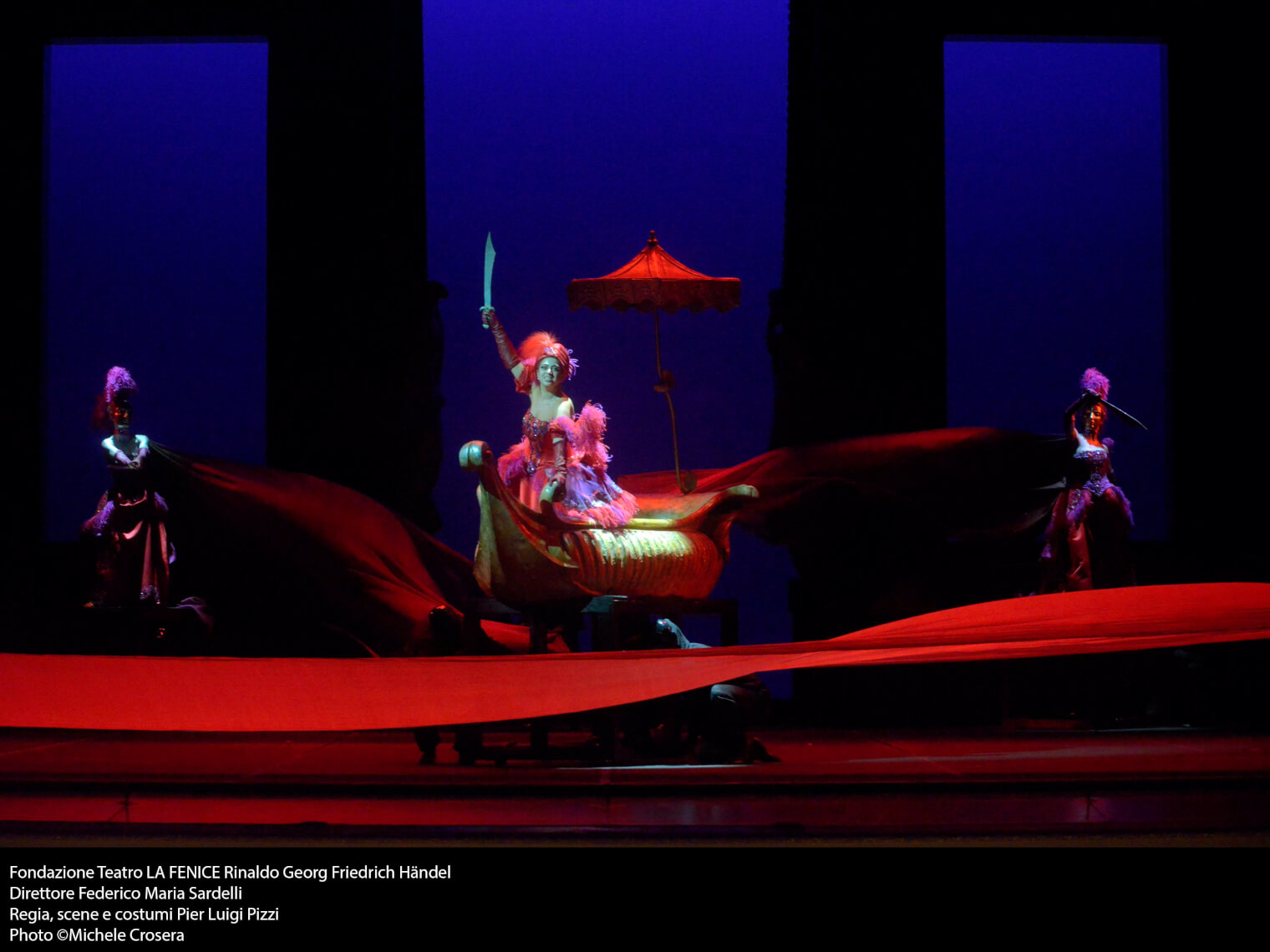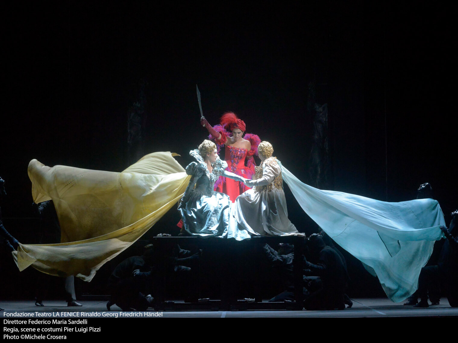 Dopo aver girato mezzo mondo, il capolavoro händeliano ripreso in questi giorni dal Teatro La Fenice di Venezia, può essere tranquillamente chiamato il “Rinaldo di Pierluigi Pizzi”. Lo spettacolo nato nel 1985 per il teatro Municipale di Reggio Emilia e ricostruito in collaborazione con il Teatro dell’Opera di Firenze, è voluto essere un omaggio (che a dire il vero sarebbe dovuto andare in scena la scorsa stagione) per il 90esimo compleanno del regista milanese che proprio a Venezia aveva fatto il suo debutto. Questo Rinaldo è forse il suo lavoro più rappresentativo visto l’approccio personale – e a questo punto centratissimo vista la longevità – di quello che era il teatro barocco, un teatro della meraviglia, in cui la parte visiva era fondamentale.Da qui nasce l’idea di partire dalla macchina scenica, che solitamente era nascosta, visualizzarla e soprattutto umanizzarla attraverso l’utilizzo di 22 servi di scena (tipici del teatro elisabettiano o del kabuki) che muovono i carri su cui si trovano i personaggi e sono i veri e propri responsabili dell’azione.