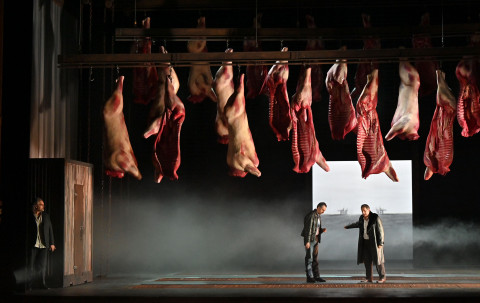 Della regia di Valentina Carrasco diremo che non aggiunge nulla di nuovo a produzioni che si vedevano nella provincia tedesca negli anni ‘90 del secolo scorso. Accolta da una grandinata di fischi alla prima recita, la Carrasco ambienta la vicenda in un porto di una grande città negli anni 60 del 1900, per la precisione nella parte refrigerata del macello, dove nel terzo atto, Simone e Fiesco, consumano il loro duetto tra mezzene di bue in un surreale slalom, per poi concludere l’opera in una catarsi bucolica dove un reale agnello sacrificale viene fatto accarezzare in scena dal nuovo Doge Gabriele Adorno. La Carrasco è abilissima ad inventare e gestire i movimenti delle masse ma non aggiunge nulla di nuovo ad una narrazione vista già molte volte, con l’aggravante di non avere almeno osato di piu’ in quelle situazioni piu’ intriganti che l’avrebbero almeno aiutata ad uscire da clichè ripetitivi.
