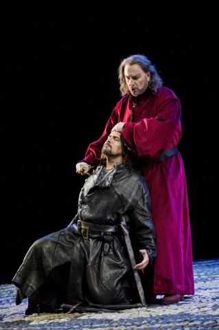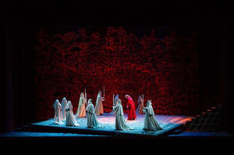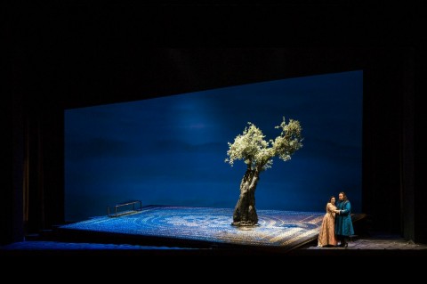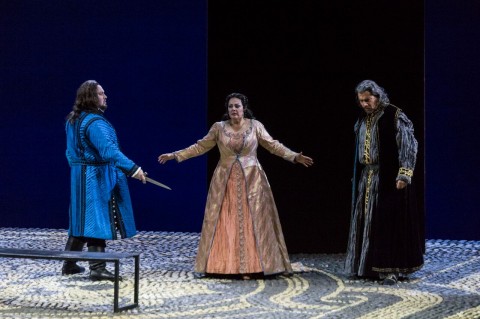 E’ arrivata a Bologna parecchio sfoltita nell’allestimento la produzione del Simon Boccanegra in coproduzione col Teatro Massimo di Palermo datata quasi dieci anni addietro. Lo spettacolo di Giorgio Gallione si basa su di una atmosfera molto rarefatta e cupa che gioca molto sui contrasti chiaro scuro delle scene di Guido Fiorato e sulle luci che Daniele Naldi vuole altrettanto in contrasto, in continua alternanza tra il rosso caldo della passione ed il freddo blu che richiama il mare. Con Genova sullo sfondo a ricordare ove si svolge l’azione, complessivamente lo spettacolo è molto lineare e semplice nella sua eleganza, senza colpi di teatro o particolari dinamismi tra i personaggi. I contrasti politici ed i complotti che ne derivano sono materia sì succulenta che con gli interpeti giusti può certo bastare a rendere esplicita la drammaticità dell’opera. Forse gli elementi scenografici mancanti davano un maggior senso di raccoglimento e concretezza all’oggetto, mentre in questo caso l’azione scenica si è svolta principalmente su di una pedana un po’ spoglia con magnifici mosaici e pochi altri elementi architettonici. In questo modo gli interpreti hanno potuto esprimersi al loro meglio guidati soprattutto dalla musica e dalle proprie sensazioni. I costumi di foggia classica sono sempre opera di Fiorato.
