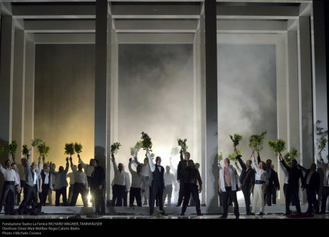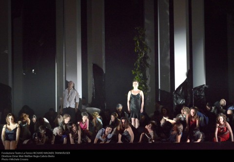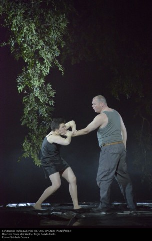 Fa veramente piacere trovare in cartellone un’opera non facile e soprattutto scenicamente impegnativa come il Tannhäuser di Wagner, ed il Teatro La Fenice di Venezia ha accettato la sfida di mettere in scena questa meraviglia con uno spettacolo intenso e ricco proposto da Calixto Bieito. Dietro ogni azione, gesto ed immagine percepita si cela infatti un concetto o comunque un pensiero volto alla riflessione. In evidenza i sentimenti e i desideri dell’uomo perennemente e storicamente combattuto tra l’amore puro verso l’amore carnale, la fedeltà verso la tentazione, il sacro verso il profano. Nell’idea del regista la natura è come una Madre assoluta alla quale tutto si piega e persino gli eventi sono deviati dai suoi desideri. Come se inghiottisse cose e persone, anche la dea Venere sembra amoreggiare o combattere con essa e, come posseduta da una forza superiore, riesce ad avvincere Tannhäuser che quindi è vittima del desiderio e delle sue debolezze. Persino la pura Elisabeth non è qui in netta contrapposizione con la sua rivale in amore, lascia la sua aura quasi sacrale che la avvicinerebbe all’amore della Vergine, per porsi con un’immagine se vogliamo aggressiva, che non cede avvinta neanche quando il regista la vede molestata durante la gara dei cantori, conservando comunque dignità ma soprattutto carattere. Lo stesso protagonista lotta con forza contro se stesso, nel cedere alle passioni sembra quasi divincolarsene energicamente.