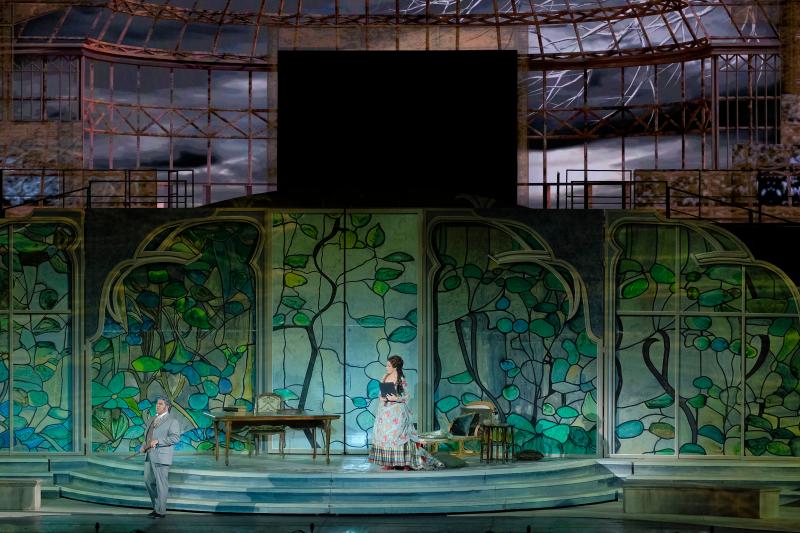 Lo spettacolo come gli altri in programmazione è realizzato con forze interne alla Fondazione e pertanto non c’è una regia particolare che muove le fila della narrazione se non il rispetto del libretto, per fortuna, e l’ausilio dei nuovi e già celebri ledwall che abbracciano il palcoscenico. Queste pareti luminose costituiscono un jolly in teoria molto funzionale, che tutto sommato potrebbe sempre tornare utile per arricchire il palco senza troppo appesantirlo come talvolta in passato, nonché rendere anche più agevole il passaggio tra un allestimento e l’altro senza dover ogni volta smontare tutto l’impianto. In questo caso l’unico elemento ‘mobile’ è una scalinata che si inserisce in tutti gli atti in modo funzionale ai diversi ambienti richiesti. Non raffinatissimo il risultato finale in verità, ma del resto Violetta non era la Duchessa di Cambridge e non stupisce se l’impatto generale dell’allestimento risulta un po’ kitsch; difatti il pubblico ha apprezzato sia il tanto colore che gli abiti ricchi di interpreti e ballerini.
