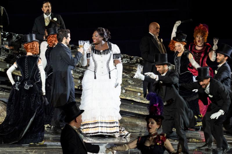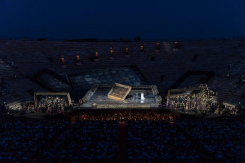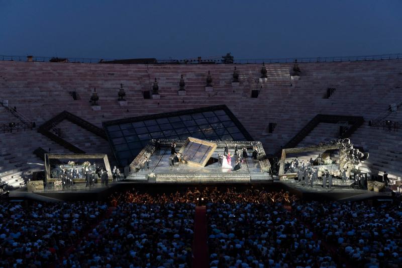 L’allestimento de La Traviata firmato da Hugo de Ana all’Arena di Verona è una delle versioni più spettacolari e suggestive del celebre melodramma di Giuseppe Verdi, che torna con un magnifico sold-out per questo centoduesimo Festival nel 2025. Lo spettacolo di De Ana, artista argentino noto per il suo stile sontuoso e visivamente potente, è noto per offrire una visione ricca, teatrale e intensa del dramma di Violetta. In questo allestimento, l’ambientazione è spettacolarmente scenografica, con costumi d’epoca sfarzosi e scenografie monumentali che sfruttano appieno le dimensioni dell’Arena. De Ana gioca con elementi simbolici e visivi molto forti: il contrasto tra il lusso sfrenato della società mondana e la fragilità interiore della protagonista. reso evidente attraverso luci, colori e movimenti coreografici quasi cinematografici. Una delle caratteristiche principali è l’attenzione al dettaglio visivo: ogni scena sembra un grande quadro vivente, curato nei minimi particolari, ad incorniciare l’estetica e la superficialità di certa borghesia dell’epoca. L'opulenza non è fine a sé stessa, ma serve a sottolineare l’ipocrisia sociale e il destino tragico di Violetta, colta tra l’amore e il giudizio della società. Nel complesso, questo allestimento è un'esperienza immersiva, che fonde la grande tradizione lirica italiana con una regia moderna e spettacolare, pensata per valorizzare la maestosità dell’Arena di Verona.