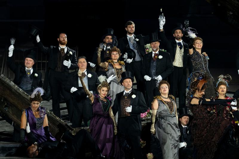 In una serata calda ed afosa possiamo immaginare le difficoltà di esordire in un anfiteatro gremito, con abiti ingombranti ed un floor inclinato e pieno di ostacoli. Così la Violetta di Angel Blue sembra poco a suo agio soprattutto nel primo atto, di conseguenza è poco centrata nel ruolo e con difficoltà a raggiungere i picchi che la tessitura vocale consente se rilassata ed a suo agio; molto meglio dopo l’intervallo, quando la sua notevole voce appare più rilassata e può esprimere al meglio i tratti drammatici dell’evoluzione del personaggio fino alla fine. Non esuberante ma dal suono piacevole e setoso la voce dell’Alfredo di Galeano Salas, elegante e generoso nel suo ruolo di amante in una storia piena di ostacoli; splendido come spesso ci troviamo a dire, Amartuvshin Enkhbat nel ruolo di papà Germont: il colore del suo timbro è nobilmente ambrato, la compostezza dell’interprete evidente, giustizia è resa ad un personaggio tanto austero quanto non facile da amare. Molto interessante Francesca Maionchi: veramente cristallina la sua voce, che dispiace poter sentire soltanto per le poche battute di Annina. Flora è Sofia Koberidze, appropriato Carlo Bosi nei panni del Visconte di Letorières; Gabriele Sagona è un buon Barone Douphol, il Marchese d'Obigny è Jan Antem, l’austero Dottore Grenvil è Giorgi Manoshvili, il Domestico di Flora, nonché Commissionario, è il debuttante in Arena Hidenori lnoue, come pure debutta in Arena Alessandro Caro nel ruolo di Giuseppe.