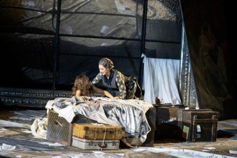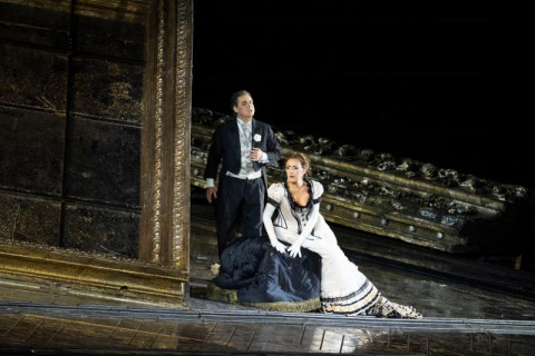 Dopo aver accantonato definitivamente (si spera} la discutibile produzione postuma di Zeffirelli, la Fondazione Arena di Verona ha scelto di riproporre La traviata nell’allestimento del 2011 firmato da Hugo de Ana, con regia ripresa da Michele Cosentino. Una scelta di repertorio che, pur garantendo una certa solidità visiva e una messa in scena di sicura funzionalità, risulta ancora una volta priva di vero slancio drammatico. La regia si affida a soluzioni ormai consunte: una narrazione letterale, illustrativa, che non tenta mai di scavare nei conflitti psicologici dei personaggi né di restituire la tensione morale che attraversa l’opera. I movimenti scenici sono prevedibili, statici, e la disposizione delle masse raramente va oltre una semplice gestione dello spazio. L’impianto visivo, dominato da scenografie monumentali e costumi eleganti ma impersonali, accentua una certa freddezza complessiva. A peggiorare l’impressione contribuisce un disegno luci piatto, inefficace nel creare profondità o atmosfere emotive, e le coreografie di Leda Lojodice, che appesantiscono ulteriormente le scene corali con movimenti artificiosi e scollegati dalla drammaturgia.