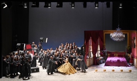 Se infatti la stanza di Violetta è degna di una principessa borbonica, fuori regna un paesaggio spoglio, desertico, ove qualche baule e pochi riflettori sembrano ricordare ed ammonire sul vivere per apparire, come in un film che naturalmente presenta tanto luci quanto ombre. Il deserto diventa poi un immenso prato verde, grazie alle luci di Roberto Tarasco, ove vive per qualche tempo l’illusione della coppia nel secondo atto, ma anche dove svanisce il sogno all’apparire di Germont padre, che dunque riporta il grigiore della delusione. La festa di Flora è quanto mai concitata, si materializzano tutte le paure di Alfredo che forse in cuor suo non ha mai creduto alla completa fedeltà della compagna: si consumano ammucchiate, gli invitati mandano baci da labbra corvine di rossetto (anche gli uomini), la stessa padrona di casa strapazza un incredulo Alfredo travolto dalla baldoria.