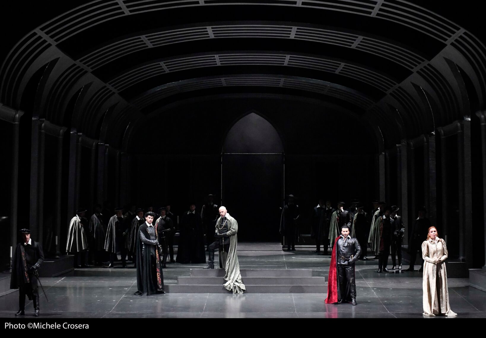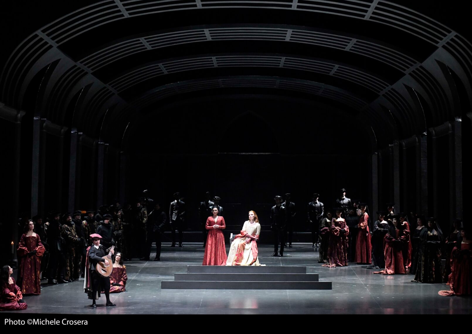Il Teatro La Fenice di Venezia raccoglie la sfida di rappresentare il lunghissimo capolavoro di Gaetano Donizetti, Anna Bolena, salutando il nuovo sovraintendente Nicola Colabianchi con quest’opera cha mancava in cartellone dal lontano 1857. Considerata uno dei capolavori del belcanto è particolarmente nota per la sua intensità drammatica e le difficoltà vocali dei suoi ruoli principali, soprattutto quello della protagonista, che deve poter sollevare la sua anima vocale fino a vette tali da far palpitare i cuori di chi ascolta. Ci vuole un cast assolutamente perfetto per metterla in scena e dalle rilevanti abilità recitative. L'opera racconta infatti gli ultimi giorni di vita della regina Anna Bolena, portandoci ai fasti del regno di Enrico VIII d’Inghilterra e delle sue sei mogli, di cui la protagonista è il secondo capitolo; una donna che dalle stelle di una vita accanto all’uomo più potente dell’epoca viene precipitata nell’abisso della colpevolezza e della condanna, inevitabilmente condotta a morte con l'accusa di tradimento e adulterio. Una donna dunque tormentata, dai sentimenti contrastanti che la vedono ancora legata al sovrano tra i fantasmi del suo vecchio amore Percy, tornato a tentarla e tormentarla, portandola verso una congiura ed una fine immeritata. Per questa operazione è stato scelto il veterano Pier Luigi Pizzi, che pensa di creare una ambientazione assolutamente asettica, in chiaroscuro, ove i personaggi sono lasciati ai loro sentimenti ad all’istinto interpretativo, proponendo elementi essenziali alla narrazione e senza stravolgerla, ed in cui quasi dal profondo buio emergono di volta in volta gli interpreti, a significare l’oscurità che sovrasta i loro destini. Potremmo essere anche in una stazione ferroviaria o in una fabbrica, con la schematicissima struttura che fa da sfondo all’azione, che come spesso accade si adatta facilmente a qualsiasi situazione in scena semplicemente aggiungendo dettagli. Molto dell’effetto visivo è dovuto alle luci di Oscar Frosio. Richiamano l’epoca i costumi prevalentemente neri e rossi, salvo i colori chiari della regina, anch’essa poi di scuro vestita dopo l’arresto, perché la luce si spegne dentro di lei e nella sua vita.