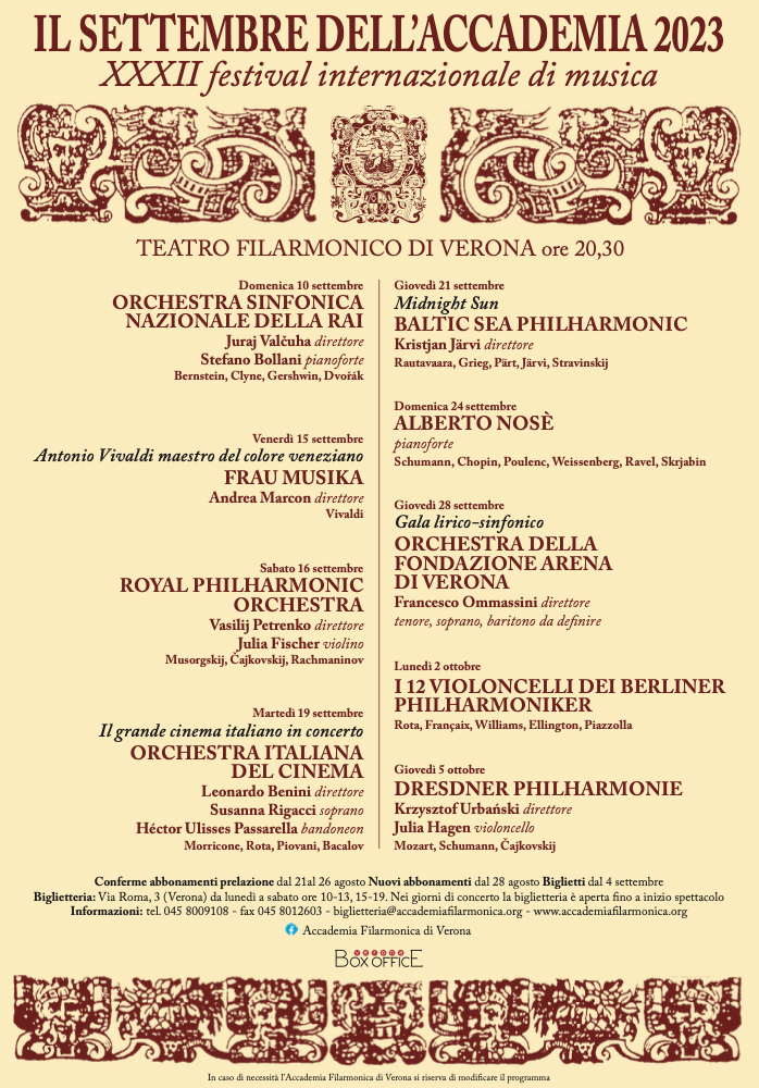 E’ ancora e sempre la grande orchestra sinfonica la protagonista del “Settembre dell’Accademia”, giunto quest’anno alla 32esima edizione. Ma con l’imperativo di mantenersi vitale e sensibile alle istanze del rinnovamento e della diversificazione, quest’anno l’Accademia Filarmonica ha voluto allargare lo sguardo anche a generi, organici e repertori diversi: dalla seducente musica americana del primo Novecento che si contamina con il jazz, alla musica da film di Morricone e Rota, entrata ormai nel canone classico, alla multiforme musica barocca nel nome tutelare della venezianità settecentesca, Antonio Vivaldi, fino a un ensemble di dodici violoncellisti fuoriclasse dei Berliner Philharmoniker impegnati in trascrizioni di ogni tipo, compresi gli evergreen di Duke Ellington e Astor Piazzolla. Accanto a queste escursioni extraterritoriali brilla il grande romanticismo, quest’anno collocato a più nord-est rispetto alla tradizione austrotedesca: Dvořák, i russi Musorgskij, Čajkovskij, Rachmninov e Stravinskij e i nordici Rautavaara., Grieg e Pärt.