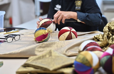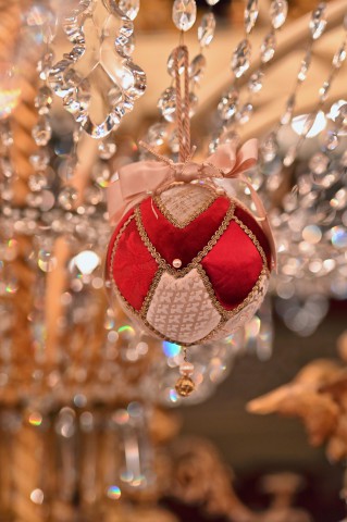 Gli stessi tessuti sono stati impiegati per la confezione di sfere sartoriali, impreziosite da perle, nastri e preziosa passamaneria, pezzi unici disponibili in dimensioni diverse per decorare la casa, oltre che l’albero natalizio.