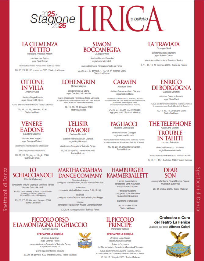 La Stagione Lirica e Balletto 2025-2026, composta da undici titoli d’opera, quattro spettacoli di danza e due nuove produzioni Education, affiancherà come di consueto grandi pagine del repertorioa titoli da tempo assenti dal palcoscenico veneziano, tra affascinanti riscoperte e opere della modernità. Il cartellone prenderà il via con La clemenza di Tito di Wolfgang Amadeus Mozart, in un nuovo allestimento di Paul Curran e con l’interpretazione musicale di Ivor Bolton. Seguiranno due titoli verdiani, entrambi ideati dal bussetano per Venezia: Simon Boccanegra, in un nuovo allestimento con la regia di Luca Micheletti e la direzione musicale di Renato Palumbo; e La traviata con la regia di Robert Carsen e le scene di Patrick Kinmonth, l’allestimento che inaugurò la Fenice ricostruita dopo l’incendio, diventato oramai una pietra miliare del repertorio feniceo. Del Vivaldi operistico sarà proposto l'Ottone in Villa, con la direzione musicale di uno specialista quale è Diego Fasolis. Dopo lunga assenza dal palcoscenico veneziano, tornerà Lohengrin di Richard Wagner, in una nuova produzione internazionale realizzata con l’Opera di Roma e il Palau de lesArts Reina Sofia di Valencia: vi si misurerà Damiano Michieletto, al debutto con un titolo del tedesco, e a dialogo con l’autorevole direzione musicale di Markus Stenz. Sarà ripresa Carmen di Georges Bizet, nel controverso e affascinante allestimento firmato da CalixtoBieito. Seguirà un titolo di rara esecuzione di Gaetano Donizetti, Enrico di Borgogna, la prima opera effettivamente rappresentata del copioso catalogo del bergamasco. Per la prima volta in Italia, andrà in scena Venere e Adone di Salvatore Sciarrino, composta per Amburgo nel 2023: la dirigerà Kent Nagano. Seguiranno due titoli dal repertorio più popolare: L’elisir d’amore di Gaetano Donizetti – una ripresa del collaudato allestimento targato Fenice – e Pagliacci di Ruggero Leoncavallo, in una nuova produzione realizzata in collaborazione con l’Accademia di Belle Arti di Venezia. Chiuderà la Stagione il dittico novecentesco composto da The Telephone di Gian Carlo Menotti e Trouble in Tahiti di Leonard Bernstein, con la regia di Gianmaria Aliverta e la direzione musicale di Francesco Lanzillotta.