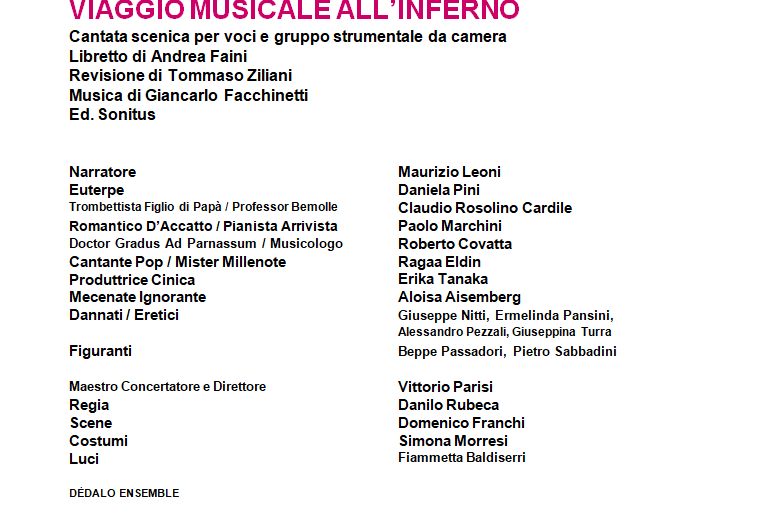 Ad interpretare per la prima volta sul palco i personaggi di Viaggio musicale all’inferno saranno Maurizio Leoni (Narratore), Daniela Pini (Euterpe) e i Dannati Claudio Rosolino Cardile, Paolo Marchini, Roberto Covatta, Ragaa Eldin, Erika Tanaka e Aloisa Aisemberg. Completano il cast gli Eretici Giuseppe Nitti, Ermelinda Pansini, Alessandro Pezzali, Giuseppina Turra.