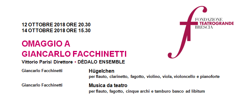 In apertura delle due rappresentazioni, dèdalo ensemble dedicherà un omaggio al Maestro Facchinetti eseguendo la seconda versione di Hügelchen – un brano del 1984 per flauto, clarinetto, fagotto, violino, viola, violoncello e pianoforte – e Musica da teatro per flauto, fagotto, cinque archi e tamburo basco ad libitum del 1974.
