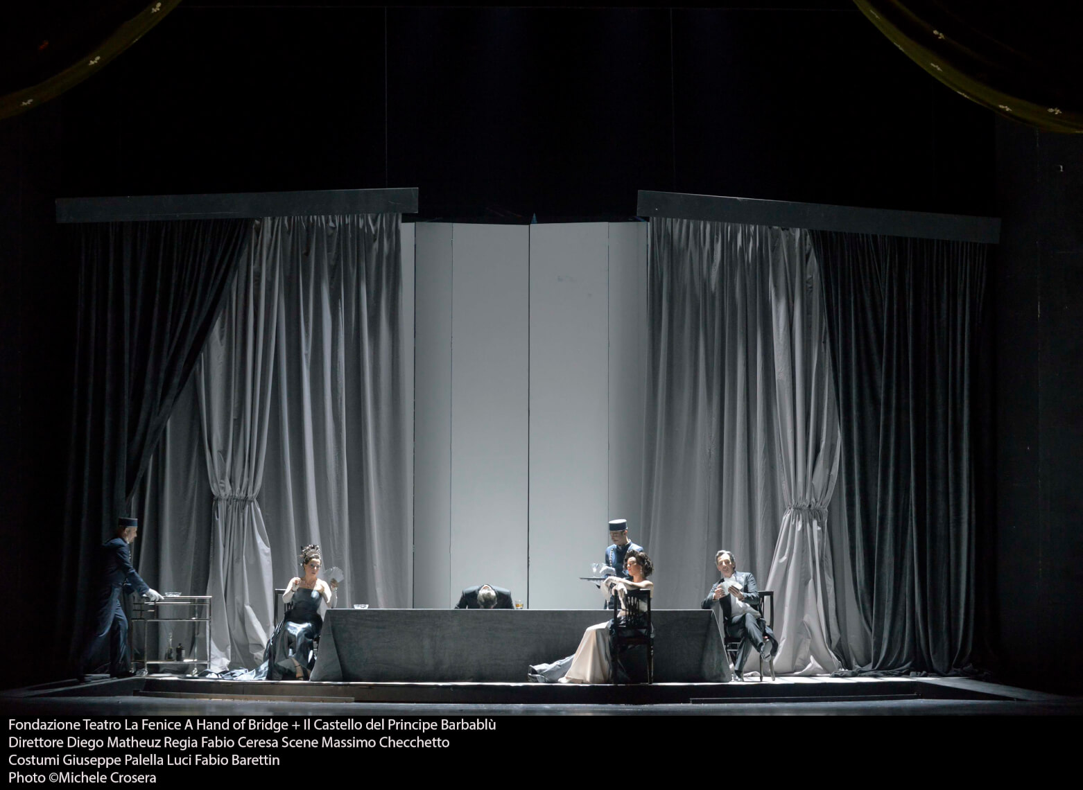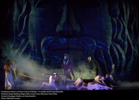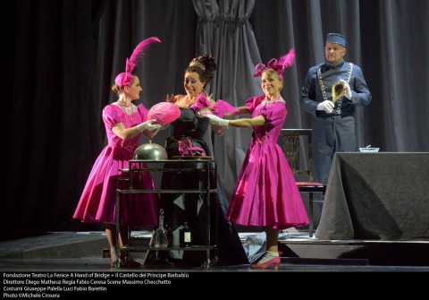 La Fenice di Venezia apre l'anno nuovo con un doppio appuntamento molto particolare che vede impegnato il regista Fabio Ceresa nel concepire due storie in cui la vita di coppia è tutt'altro che facile, tanto nel reale con Barber, per la prima parte, quanto nella favola truculenta con Bartók per la seconda parte. 'A hand of bridge' è uno scorcio di vita famigliare in cui nessuna delle due coppie protagoniste è realmente felice e nell'arco di questa mano di gioco i quattro giocatori si lasciano andare a fantasie che portano lontano la loro mente. La stanza da gioco è allestita con un tavolo lungo il quale sono disposte le coppie e davanti a cui si materializzano le rispettive fantasie. Per una composizione brevissima Ceresa non si è risparimato in costumi, opera di Giuseppe Palella, comparse e coreografie curate da Mattia Agatiello per un effetto visivo garbato ed attraente. I protagonisti hanno dato tutto il possibile nei brevissimi interventi a loro destinati. Annunciato indisposto, Gidon Saks ha in un certo modo assecondato la sua voce per esprimere un personaggio estremamente sofferente; il suo David recita più che cantare e le sue visioni immerso nei soldi e nel desiderio di una vita diversa dall'attuale sono sottolineati da un canto nervoso se non nevrotico; così la consorte di mezza età interpretata da Ausrine Stundyte è una donna tormentata dai fantasmi del passato e dal suo rapporto difficile con la madre; chiaro che anche per lei esprimersi con foga e sofferenza, anche grazie al timbro robusto che possiede, è stata la cifra interpretativa del ruolo di Geraldine. Più particolare e magari affine al pubblico la coppia Sally/ Billy. Lui uomo gelosissimo dell'amante con allucinazioni rosate che esprimono un desiderio di dolcezza evidentemente inappagato, lei del tutto presa dal meraviglioso cappellino visto in una vetrina. Tanto la Sally di Manuela Custer è esplicitamente civettuola e frivola, in certi vezzi vocali che si concede, tanto il 'suo' compagno Billy, Christopher Lemmings, è visionario e quasi ridicolo nei desideri maschili piuttosto scontati, con una voce che ne sottolinea le intenzioni. E come fossimo entrati in una stanza sbirciando dalla finestra ne usciamo all'improvviso con le luci che si estinguono pian piano, tutte calibrate su toni del grigio, come la vita delle due coppie, del rosa dei sogni e del bianco e nero.
