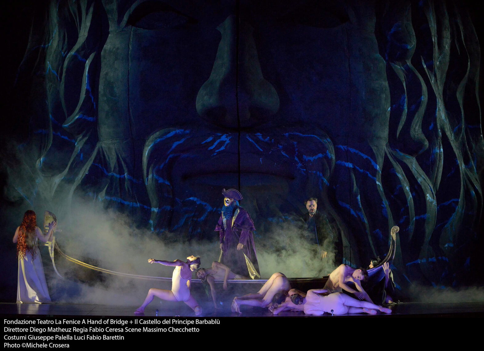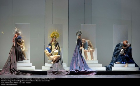 Il setting è molto azzeccato, anche in questo caso i colori delle luci di Fabio Barettin e dei costumi di che si intersecano con le scene di Massimo Checchetto sono una esemplificazione degli stati d’animo che Ceresa pone nella mente di Barbablu; ogni colore ha un preciso significato. Persino un omaggio a Venezia con una gondola nella stanza del lutto, una sorta di barca di Caronte nel mare di lacrime in scena. Il tutto è contenuto in una testa gigante, la testa di Barbablù che svela dalle porte frontali le sette stanze del percorso psicologico e definitivo. Stupendi i costumi di Giuseppe Palella che rendono prezioso uno spettacolo cui sicuramente il regista ha dato una impronta personale.