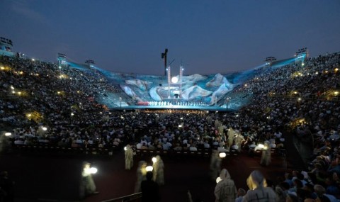 Ritorna sulle tavole dell'immenso palcoscenico dell'Arena di Verona, l'Aida del centenario proposta dal team del catalano La Fura dels Baus nel 2013 e qui riproposta felicemente.